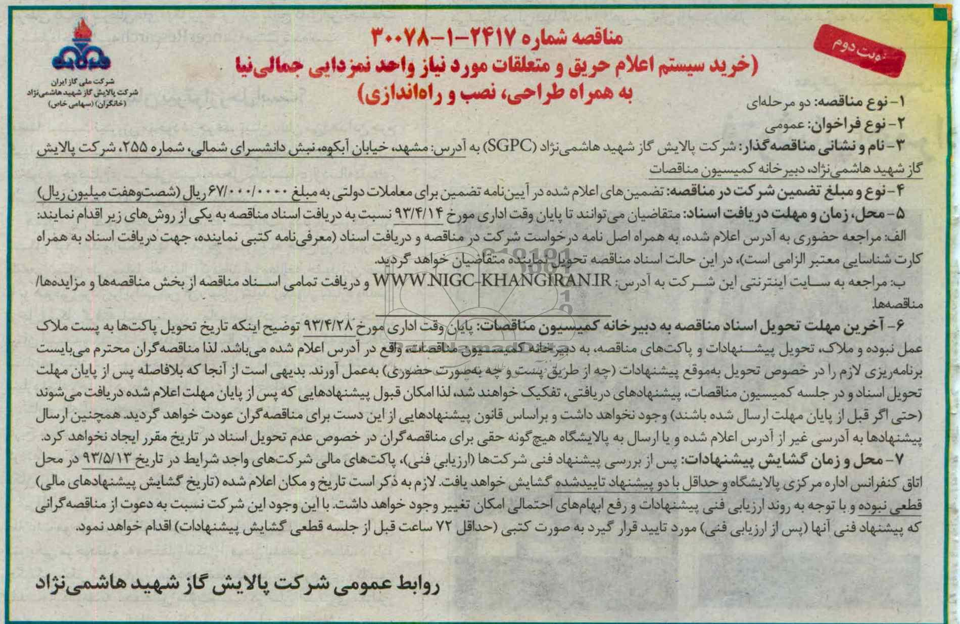نام و نشانی مناقصه گزار: شرکت پالایش گاز شهید هاشمی نژاد (SGPC) به آدرس مشهد خیابان آبکوه نبش دانشسرای شمالی شماره 255 شرکت پالایش گاز شهید هاشمی نژاد دبیرخانه کمیسیون مناقصات