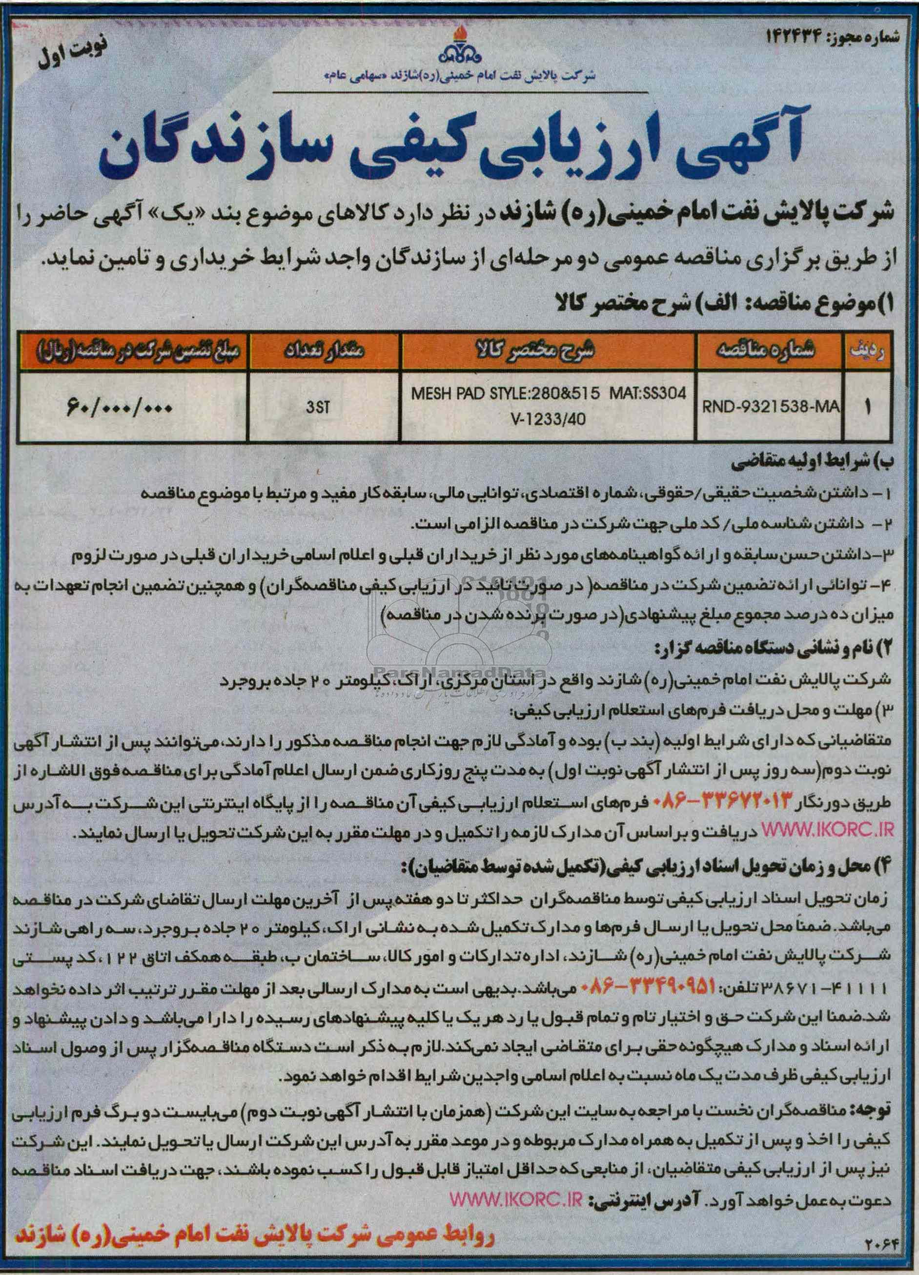 شرکت پالایش نفت امام خمینی ره شازند در نظر دارد کالای موضوع بند یک آگهی حاضر را از طریق برگزاری مناقصه عمومی دو مرحله ای از سازندگان واجد شرایط خریداری و تامین نماید.