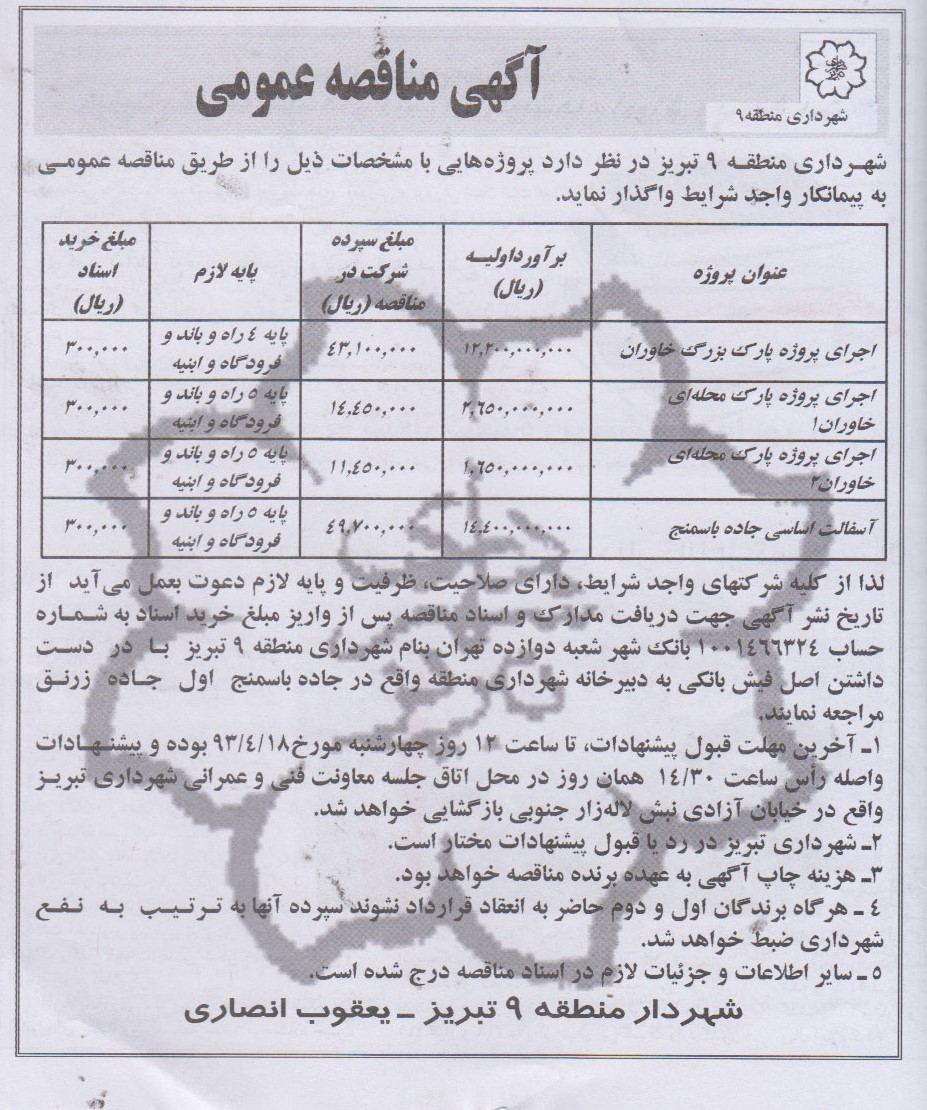 آخرین مهلت قبول پیشنهادات تا ساعت 12 روز چهارشنبه مورخ 93.4.18 بوده و پیشنهادات واصله راس ساعت 14:30 همانروز در محل اتاق جلسه معاونت فنی و عمرانی شهرداری تبریز واقع در خیابان آزادی نبش لاله زار جنوبی بازگشایی خواهد شد