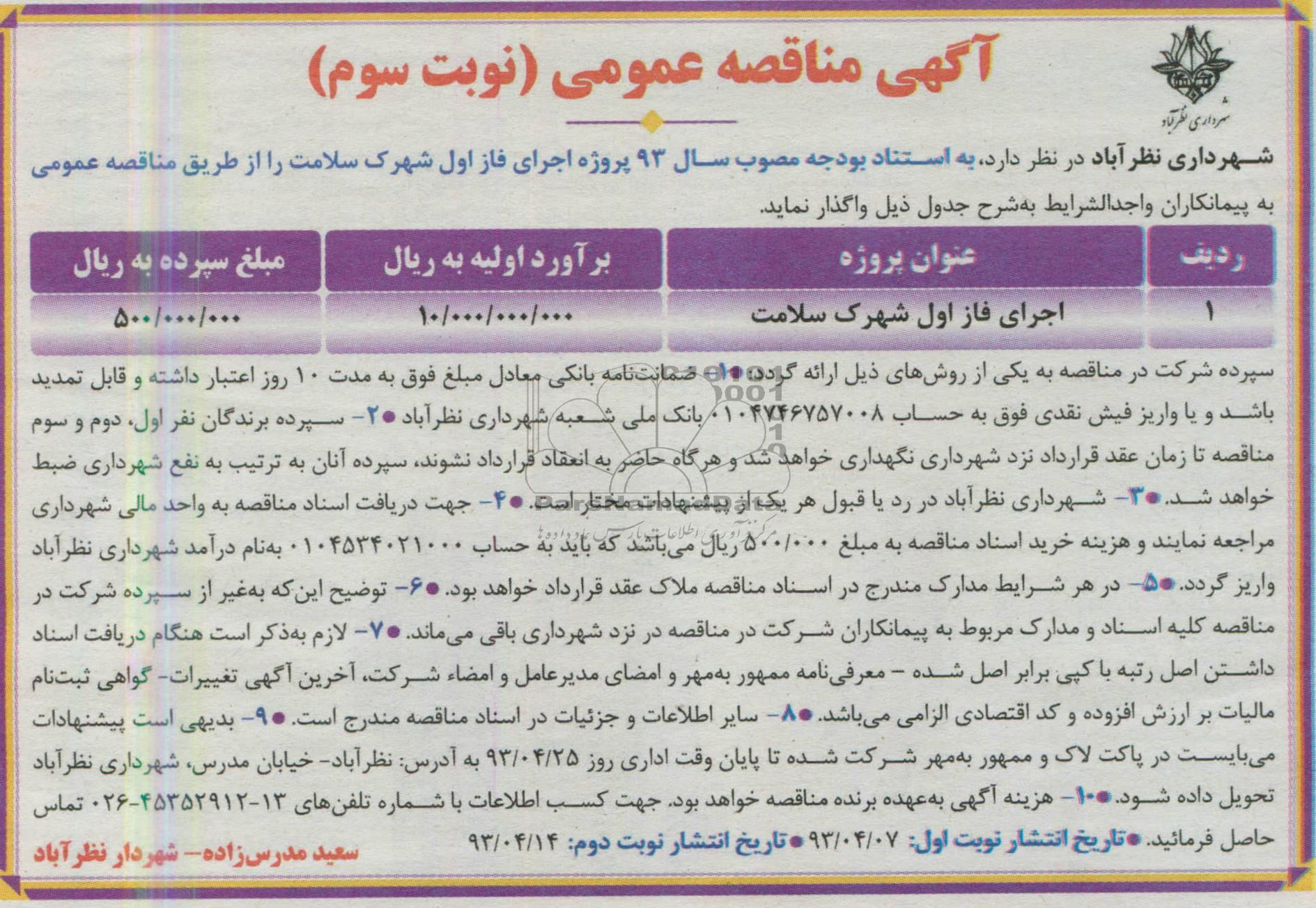 بدیهی است پیشنهادات می بایست در پاکت لاک و ممهور به مهر شرکت شده تا پایان وقت اداری روز 93.4.25 به آدرس نظرآباد خیابان مدرس شهرداری نظرآباد تحویل داده شود