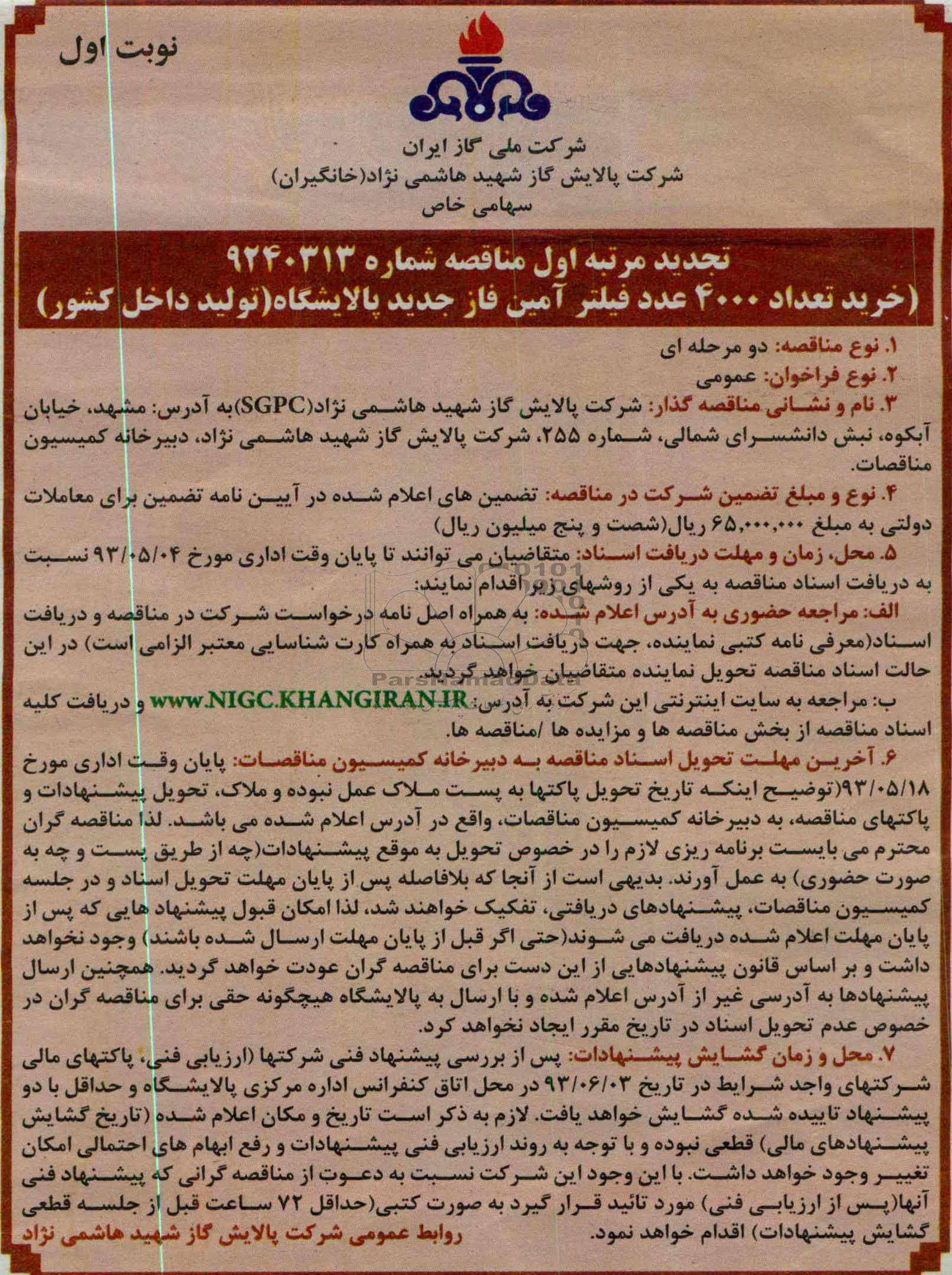7- محل و زمان گشایش پیشنهادات : پس از بررسی پیشنهاد فنی شرکت ها ارزیابی فنی، پاکت های مالی شرکت های واجد شرایط در تاریخ 93.6.3 در محل اتاق کنفرانس اداره مرکزی پالایشگاه و حداقل با دو پیشنها دتایید شده گشایش خواهد یافت. لازم به ذکر است تاریخ و مکان اعلام شده تاریخ گشایش پیشنهادهای مالی قطعی نبوده و با توجه به روند ارزیابی فنی پیشنهادات و رفع ابهام های احتمالی تغییر وجود خواهد داشت. با این وجود این شرکت نسبت به دعوت از مناقصه گرانی که پیشنهاد فنی آن ها پس از ارزیابی فنی مورد تایید قرار گیرد به صورت کتبی (حداقل 72 ساعت قبل از جلسه قطعی گشایش پیشنهادات) اقدام خواهد نمود.