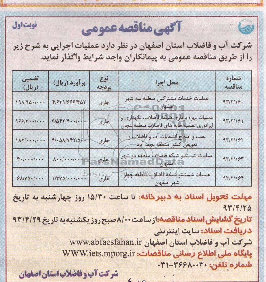 شرکت آب و فاضلاب استان اصفهان در نظر دارد عملیات اجرایی به شرح زیر را از طریق مناقصه عمومی به پیمانکاران واجد شرایط واگذار نماید.