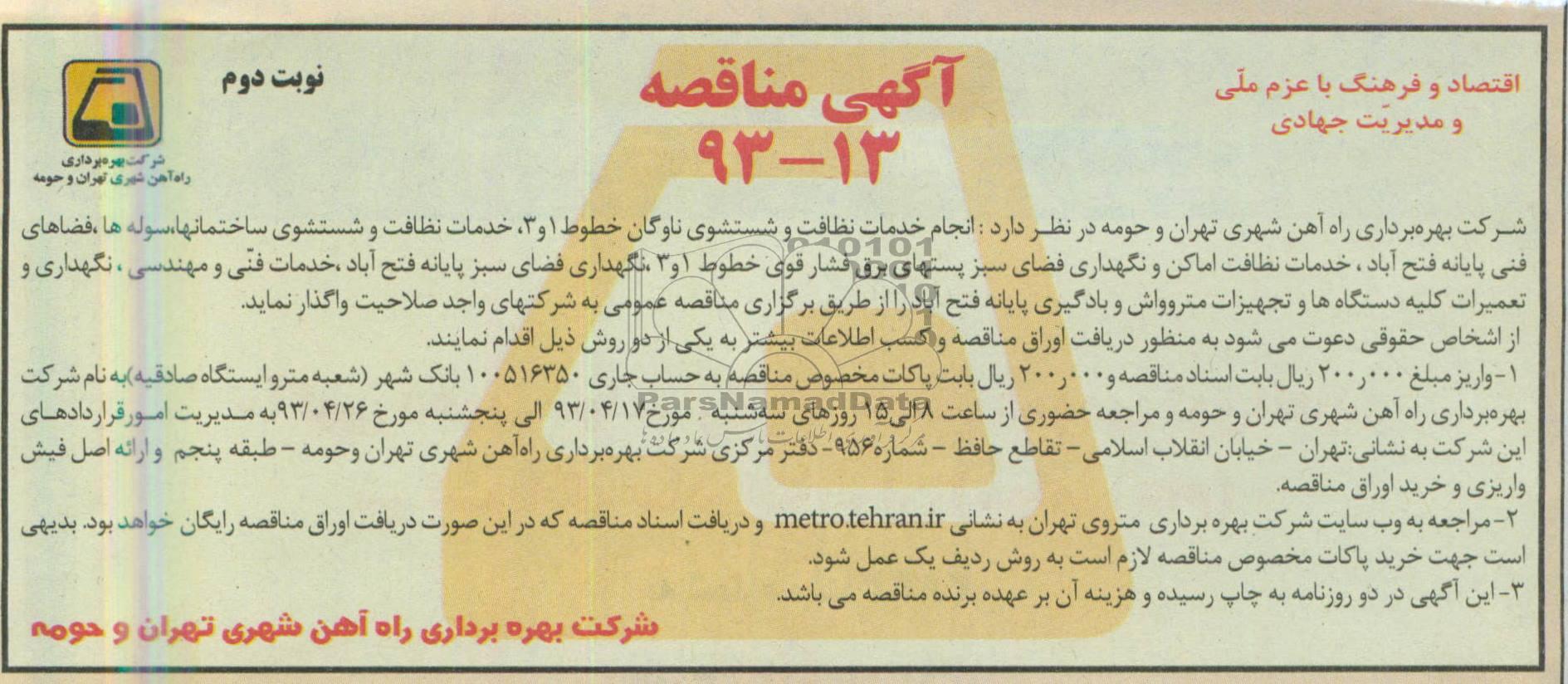 شرکت بهره برداری راه آهن شهری تهران و حومه در نظر دارد انجام خدمات نظافت و شستشوی ناوگان خطوط 1 و 3 , خدمات نظافت و شستشوی ساختمانها , سوله ها , فضاهای فنی پایانه فتح آباد , خدمات نظافت اماکن و نگهداری فضای سبز پستهای برق فشار قوی خطوط 1 و 3 نگهداری فضای سبز پایانه فتح آباد , خدمات فنی و مهندسی , نگهداری و تعمیرات کلیه دستگاهها و تجهیزات متروواش و بادگیری پایانه فتح آباد را از طریق برگزاری مناقصه عمومی به شرکتهای واجد شرایط صلاحیت واگذار نماید