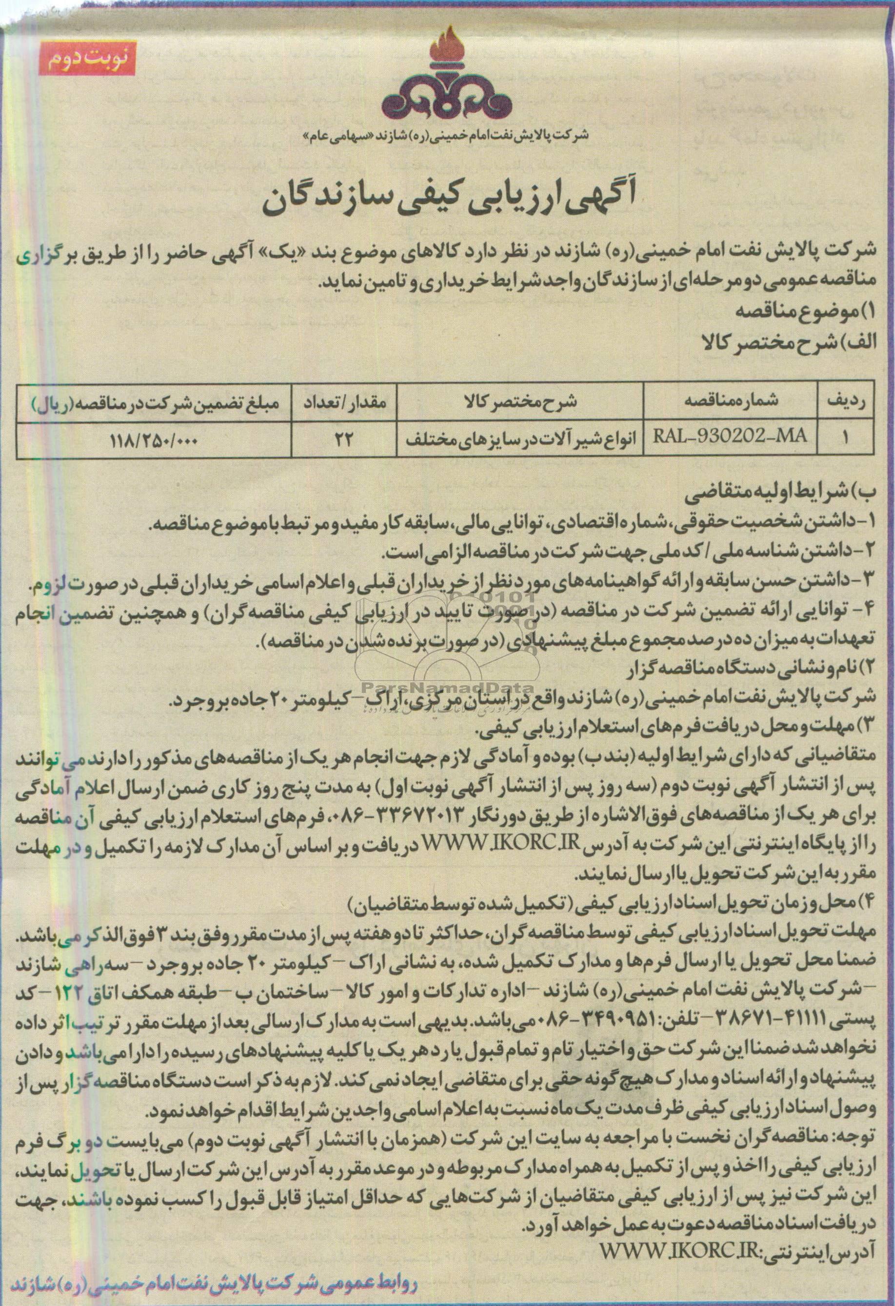 متقاضیانی که دارای شرایط اولیه در بند ب بوده و آمادگی لازم جهت انجام هر یک از مناقصه های مذکور را دارند می توانند پس از انتشار نوبت دوم (سه روز پس از درج اگهی نوبت اول) به مدت پنج روز کاری ضمن ارسال تقاضای شرکت در مناقصه موردنظر از طریق نمابر 33672013-086 فرم های استعلام ارزبابی کیفی را از طریق پایگاه اینترنتی این شرکت به آدرس WWW.IKORC.IR دریافت بر اساس آن مدارک لازمه را تکمیل و به این شرکت تحویل یاارسال نمایند.