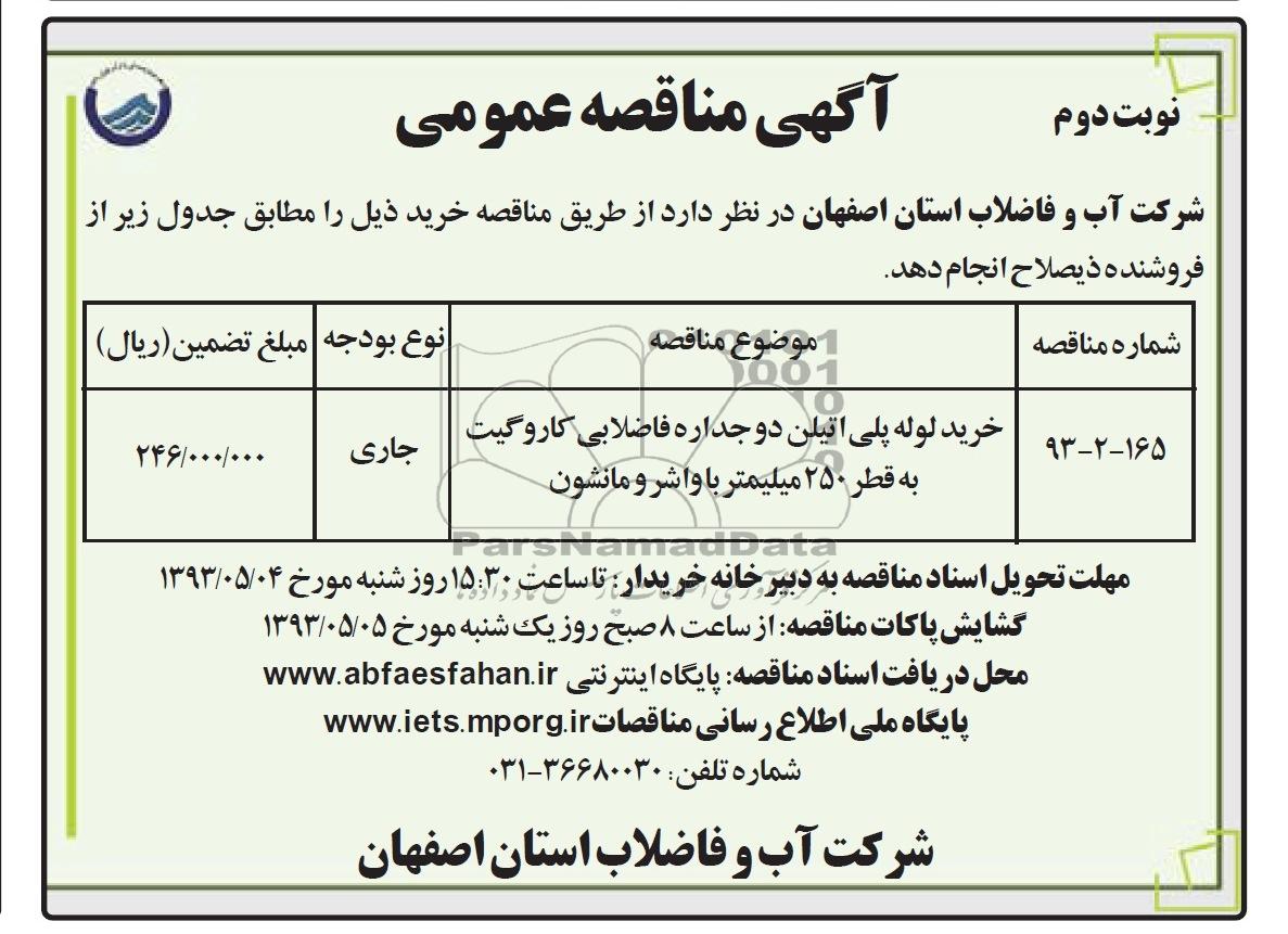محل دریافت اسناد مناقصه : پایگاه اینترنتی WWW.ABFAESFAHAN.IR