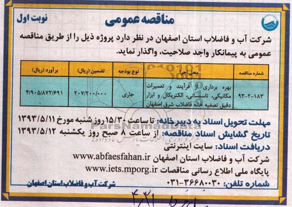 | 183-2-93 | بهره برداری از فرآیند و تعمیرات مکانیکی تاسیساتی ،الکتریکال و ابزار دقیق تصفیه خانه فاضلاب شرق اصفهان |