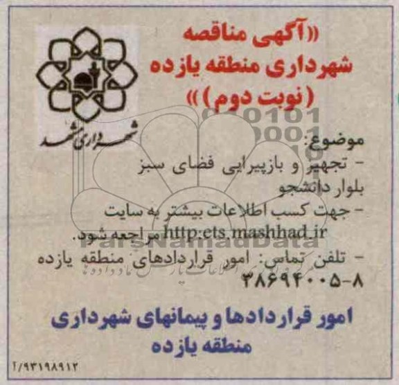 علاقهمندان میتوانند جهت دریافت اسناد و اطلاعات تکمیلی، مناقصه تجهیز و بازپیرایی فضای سبز با سامانه مناقصات و مزایدات ایران پارسنماد داده ها 88349670 تماس حاصل نمایند.