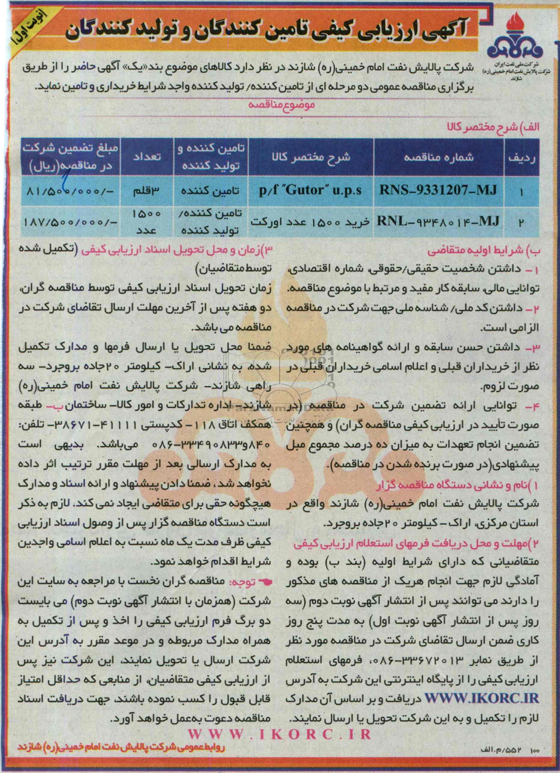 مناقصه P/F GUTOR U.P.S و ..., آگهی ارزیابی کیفی تامین کنندگان و تولیدکنندگان , مناقصه P/F GUTOR U.P.S و ...