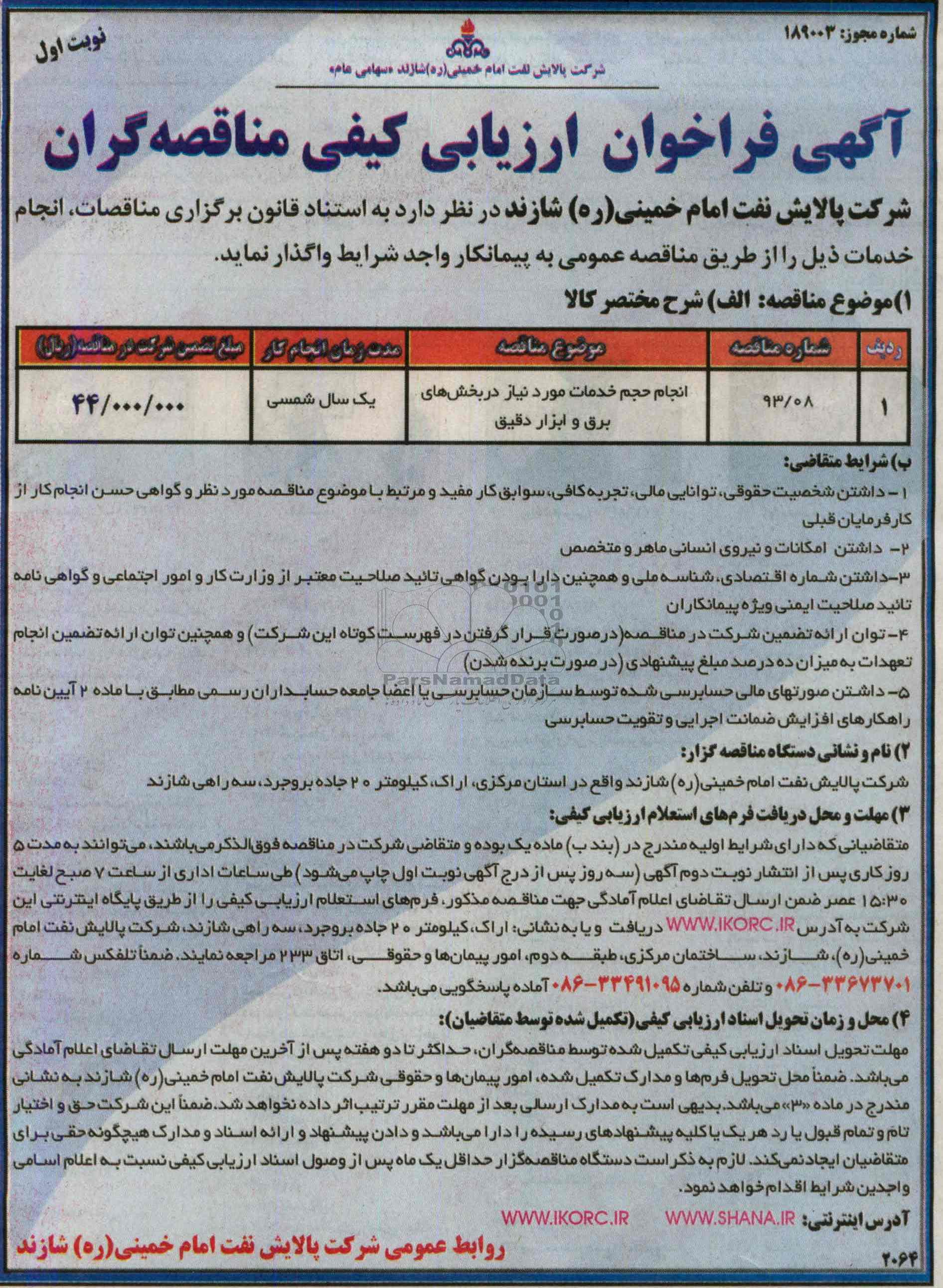 | 1 | 93/08 | انجام حجم خدمات مورد نیاز در بخش های برق و ابزار دقیق |