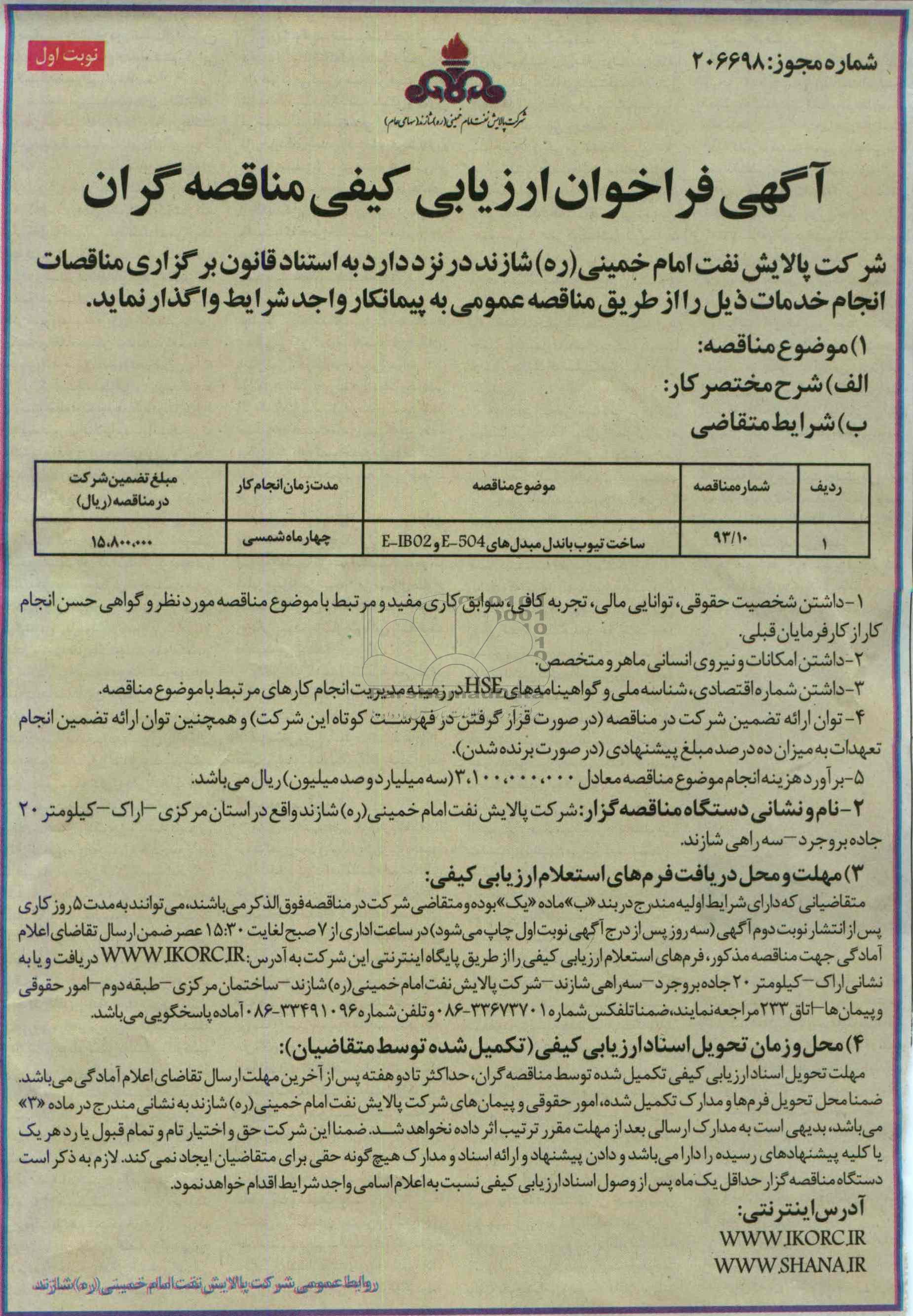 مهلت و محل دریافت فرم های استعلام ارزیابی کیفی: متقاضیانی که دارای شرایط اولیه مندرج در بند (ب) ماده (یک) بوده و متقاضی شرکت در مناقصه فوق الذکر می باشند ، می توانند به مدت 5 روز کاری پس از انتشار نوبت دوم آگهی ( سه روز پس از درج آگهی نوبت اول چاپ می شود ) در ساعت اداری از 7 صبح لغایت 15:30 عصر ضمن ارسال تقاضای اعلام آمادگی جهت مناقصه مذکور ، فرم های استعلام ارزیابی کیفی را از طریق پایگاه اینترنتی این شرکت به آدرس www.ikorc.ir دریافت و پایه نشانی اراک - کیلومتر 20 جاده بروجرد - سه راهی شازند - شرکت پالایش نفت امام خمینی (ره) شازند ) ساختمان مرکزی - طبقه دوم - امور حقوقی و پیمان ها - اتاق 233 مراجعه نمایند، ضمنا تلفکس شماره 33673701-086 و تلفن شماره 33491096-086 آماده پاسخگویی می باشد.