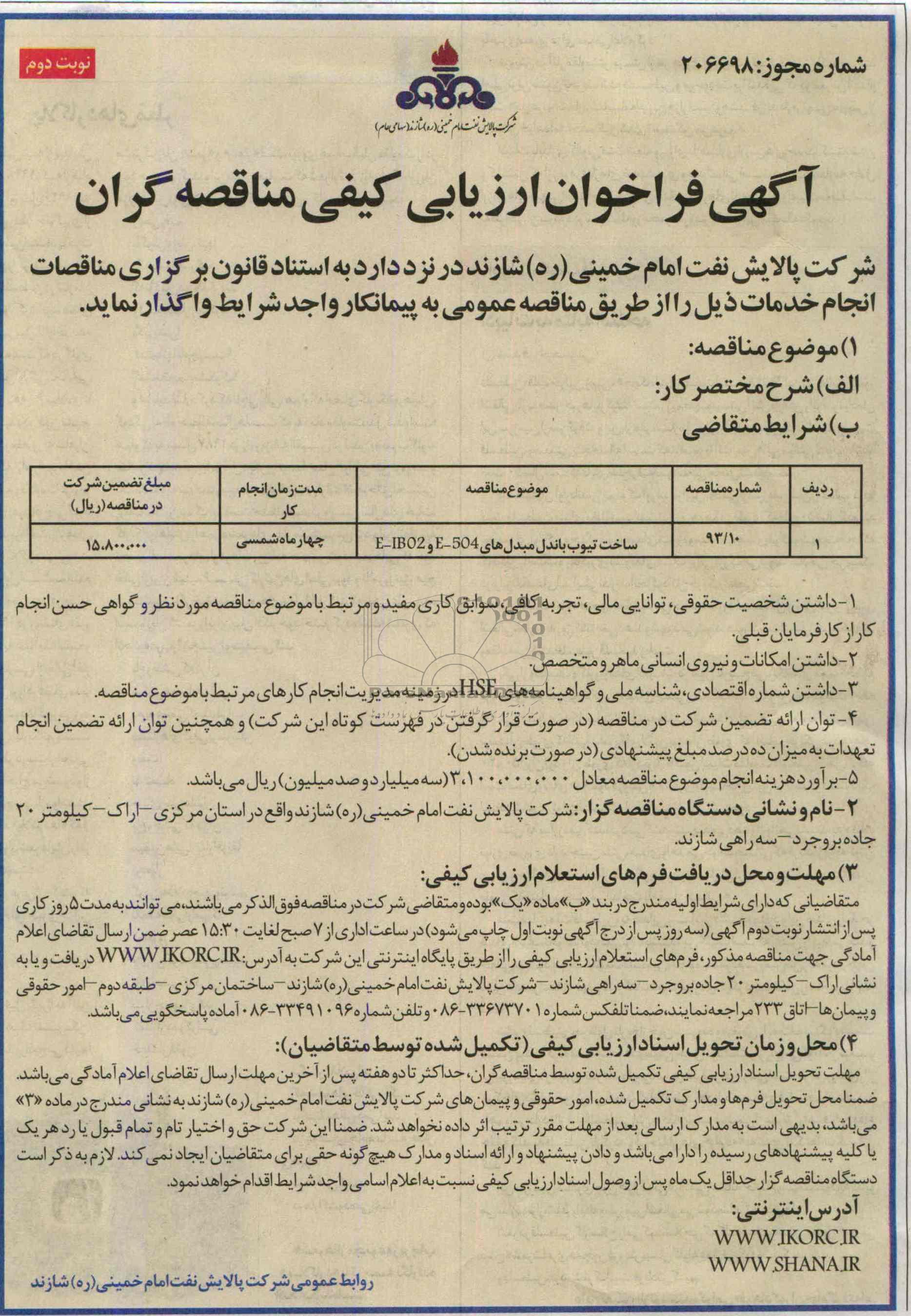 مهلت و محل دریافت فرم های استعلام ارزیابی کیفی: متقاضیانی که دارای شرایط اولیه مندرج در بند (ب) ماده (یک) بوده و متقاضی شرکت در مناقصه فوق الذکر می باشند ، می توانند به مدت 5 روز کاری پس از انتشار نوبت دوم آگهی ( سه روز پس از درج آگهی نوبت اول چاپ می شود ) در ساعت اداری از 7 صبح لغایت 15:30 عصر ضمن ارسال تقاضای اعلام آمادگی جهت مناقصه مذکور ، فرم های استعلام ارزیابی کیفی را از طریق پایگاه اینترنتی این شرکت به آدرس www.ikorc.ir دریافت و پایه نشانی اراک - کیلومتر 20 جاده بروجرد - سه راهی شازند - شرکت پالایش نفت امام خمینی (ره) شازند ) ساختمان مرکزی - طبقه دوم - امور حقوقی و پیمان ها - اتاق 233 مراجعه نمایند، ضمنا تلفکس شماره 33673701-086 و تلفن شماره 33491096-086 آماده پاسخگویی می باشد.
