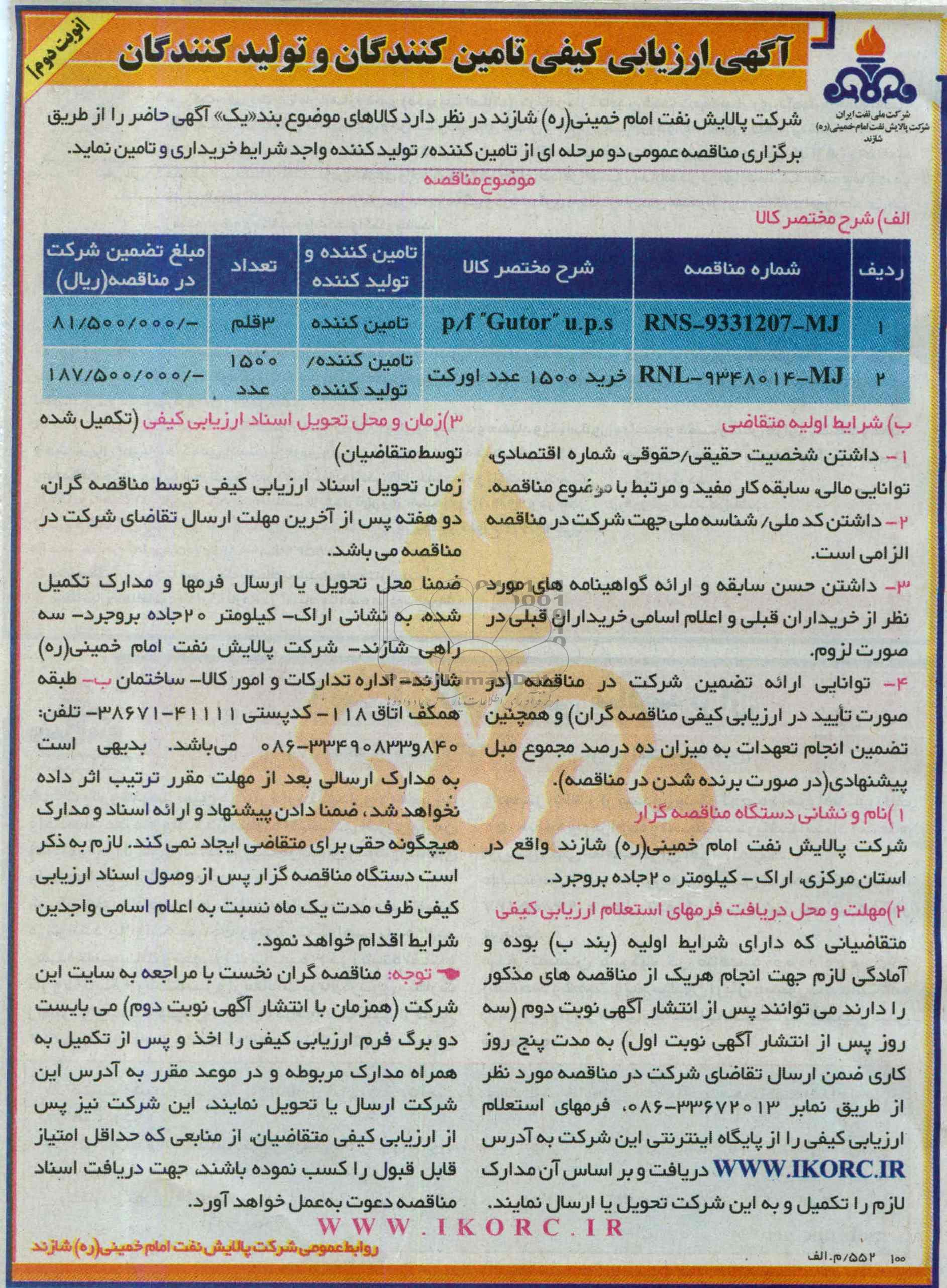 مناقصه P/F GUTOR U.P.S و ..., آگهی ارزیابی کیفی تامین کنندگان و تولیدکنندگان , مناقصه P/F GUTOR U.P.S و ...