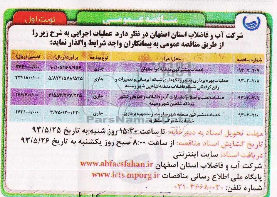 | 208-2-93 | عملیات بهره برداری تعمیر و نگهداری شبکه آبرسانی و تعمیرات و رفع گرفتگی شبکه فاضلاب منطقه شاهین شهر و میمه |