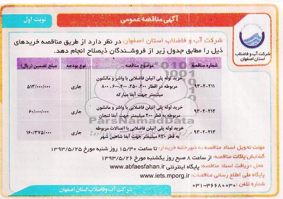 | 93-2-212 | خرید لوله پلی اتیلن فاضلابی با واشر و مانشون مربوطه به قطر 200 میلیمتر جهت آبفا لنجان | جاری | 60.000.000 |