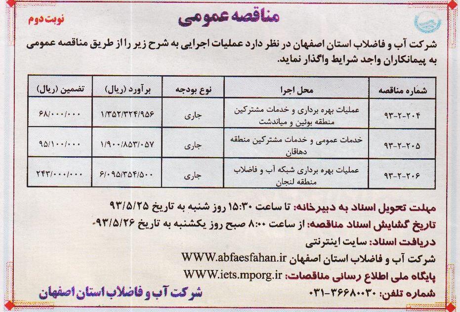 شرکت آب و فاضلاب استان اصفهان در نظر دارد عملیات اجرایی به شرح زیر را از طریق مناقصه عمومی به پیمانکاران واجد شرایط واگذار نماید:
