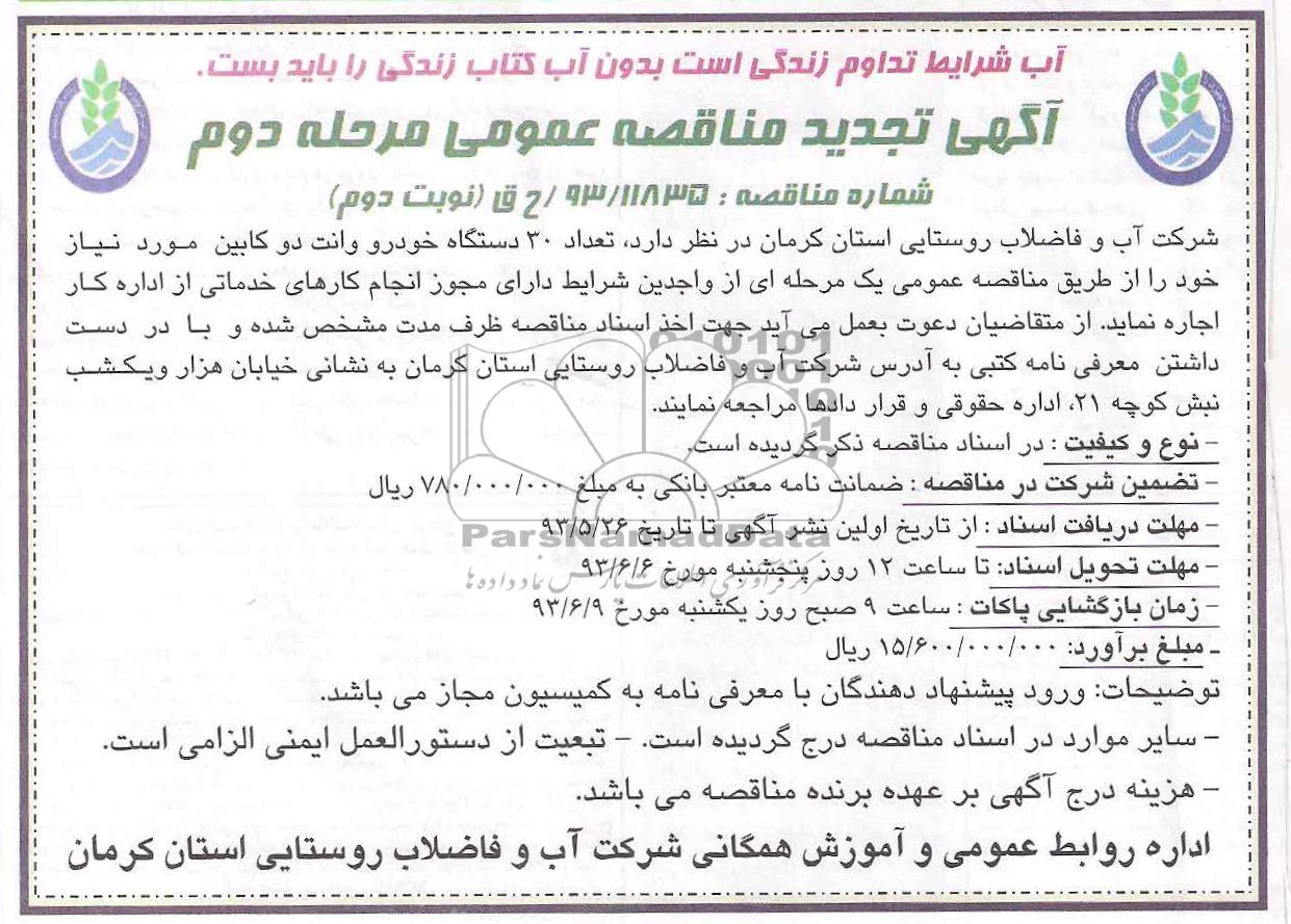 از متقاضیان دعوت بعمل می اید جهت اخذ اسناد مناقصه ظرف مدت مشخص شده و بادر دست داشتن معرفی نامه کتبی به ادرس شرکت آب و فاضلاب روستایی استان کرمان به نشانی خیابان هزار و یکشب نبش کوچه 21 اداره حقوقی و قراردادها مراجعه نمایند