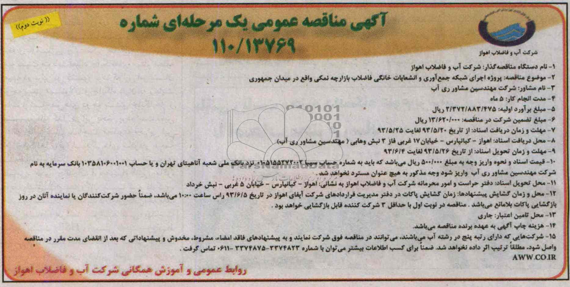 نام دستگاه مناقصه گزار : شرکت آب و فاضلاب اهواز