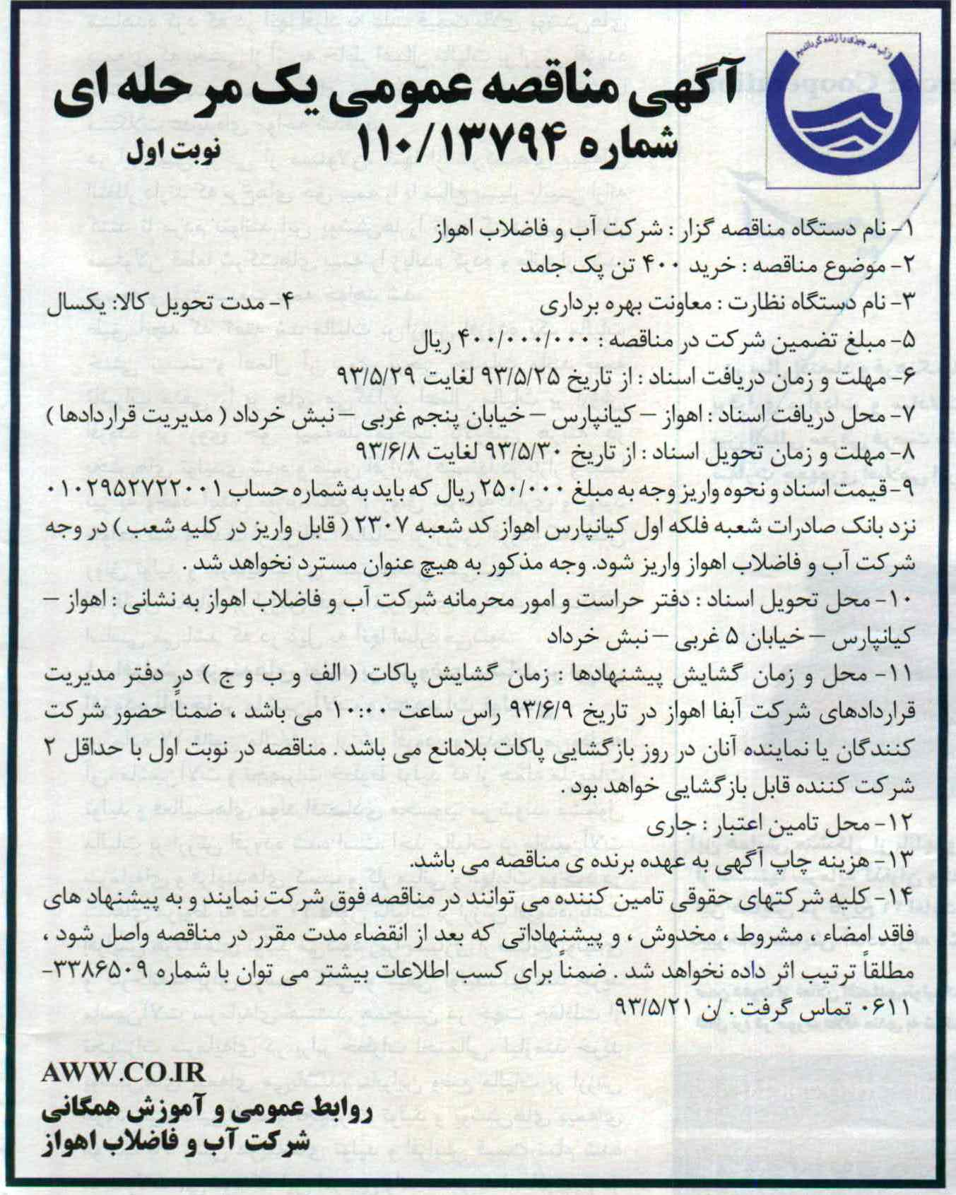نام دستگاه مناقصه گزار : شرکت آب و فاضلاب اهواز