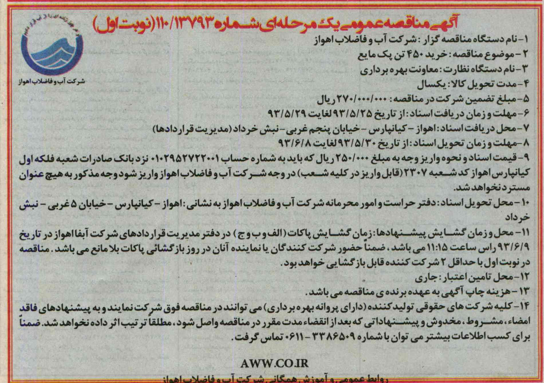 نام دستگاه مناقصه گزار : شرکت آب و فاضلاب اهواز