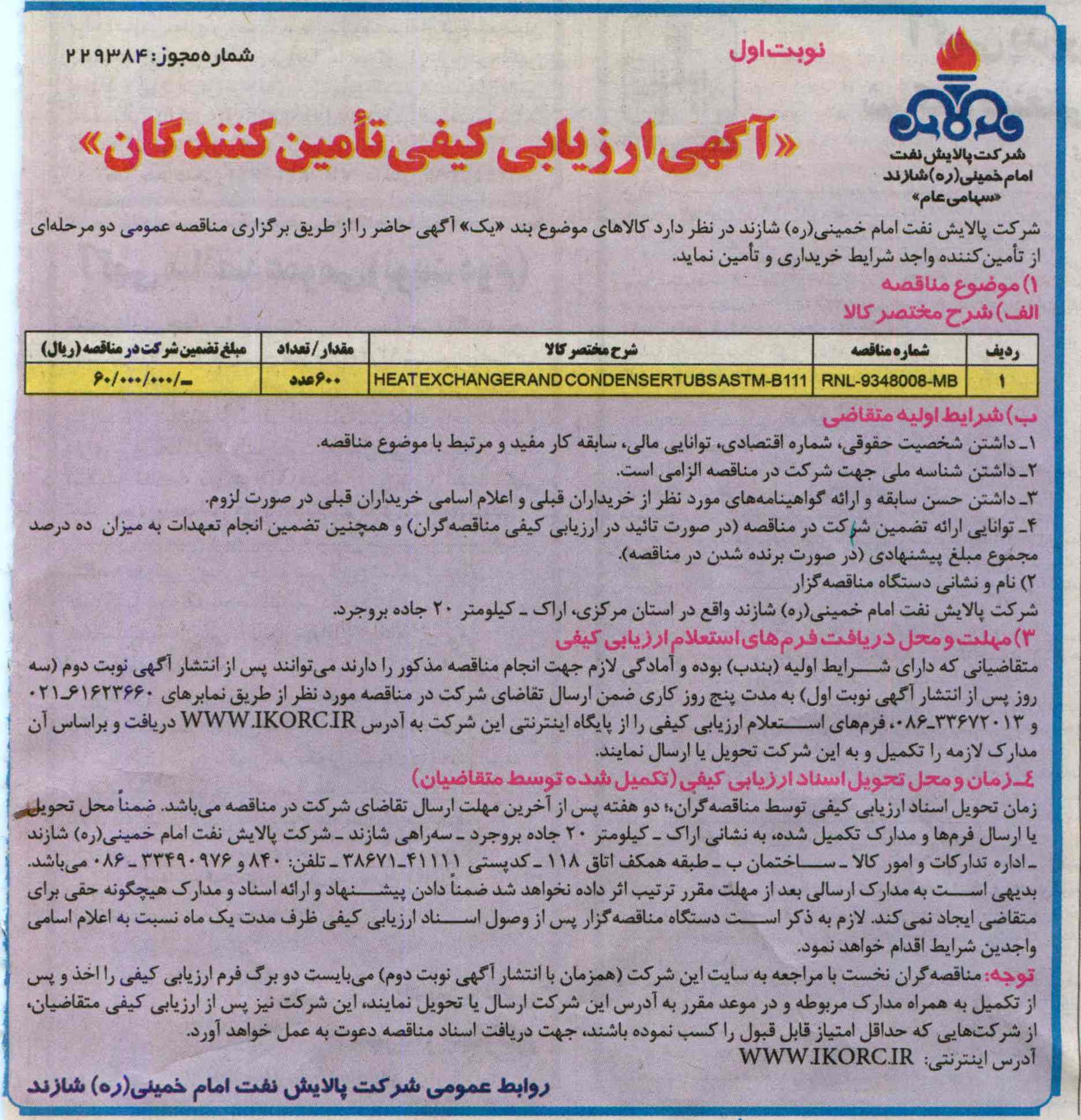 نام و نشانی دستگاه مناقصه گزار: شرکت پالایش نفت امام خمینی (ره) شازند واقع در استان مرکزی، اراک، کیلومتر 20 جاده بروجرد