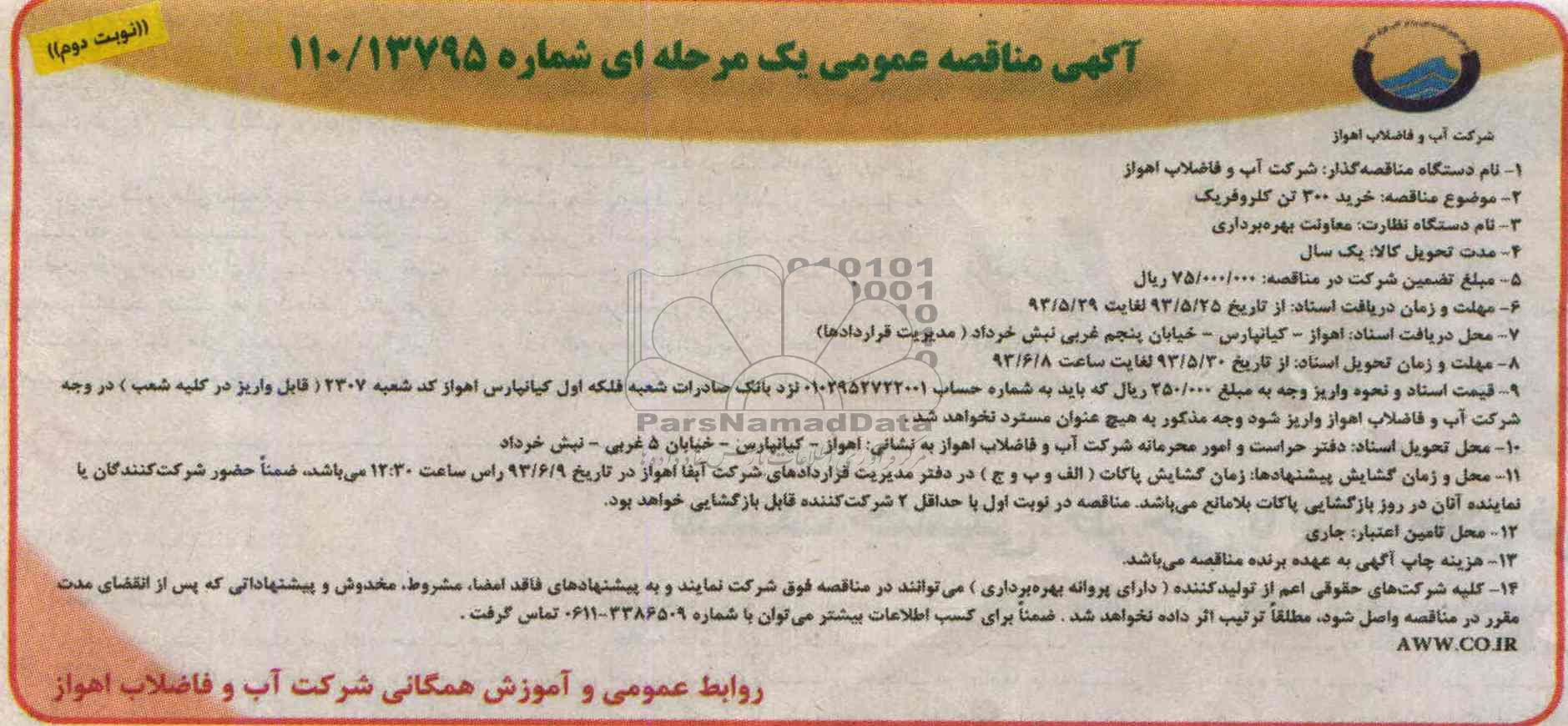 مناقصه خرید 300 تن کلروفریک , آگهی مناقصه عمومی یک مرحله ای , مناقصه خرید 300 تن کلروفریک