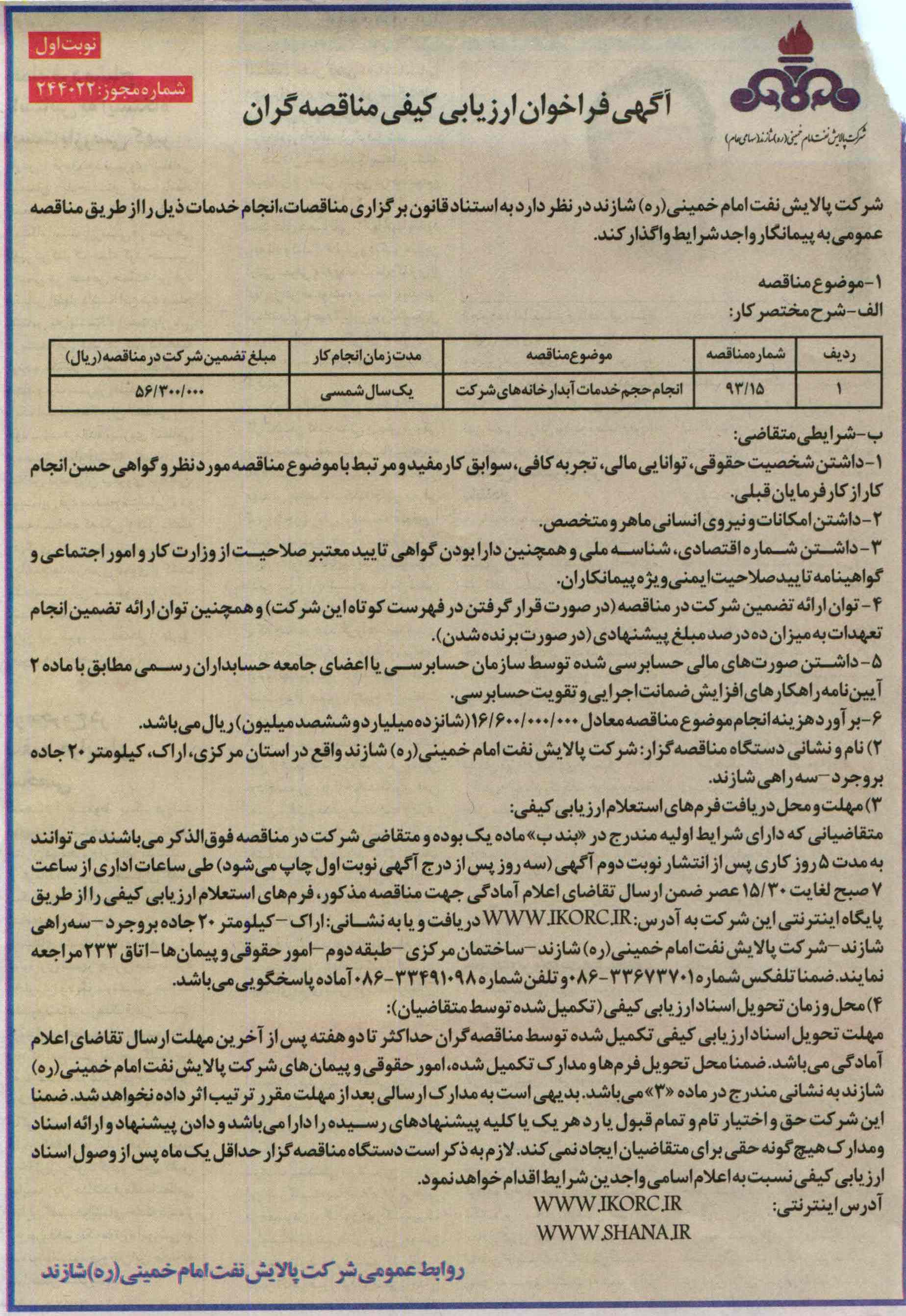 شرکت پالایش نفت امام خمینی (ره) شازند در نظر دارد به استناد قانون برگزاری مناقصات، انجام خدمات ذیل را از طریق مناقصه عمومی به پیمانکار واجد شرایط واگذار کند.