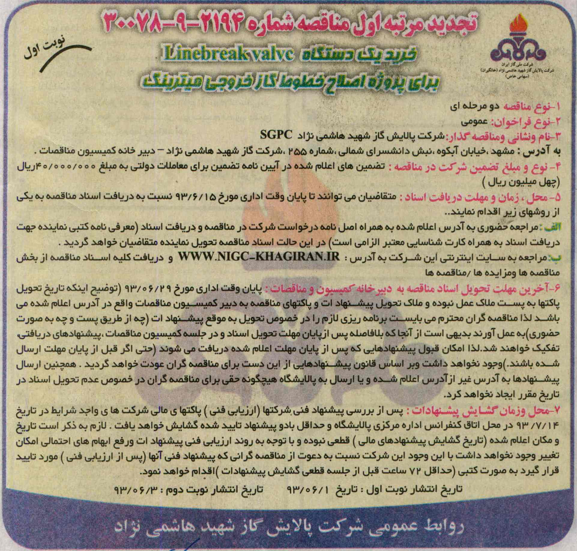 نام و نشانی مناقصه گذار: شرکت پالایش گاز شهید هاشمی نژاد SGPC