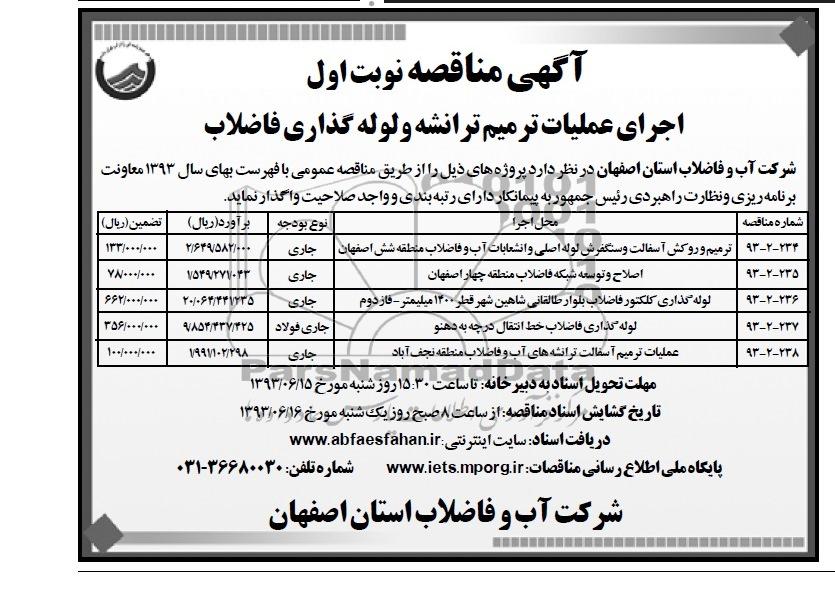 شرکت آب و فاضلاب استان اصفهان در نظر دارد پروژه های ذیل را از طریق مناقصه عمومی با فهرست بهای سال 1393 معاونت برنامه ریزی و نظارت راهبردی رئیس جمهور به پیمانکار دارای رتبه بندی و واجد صلاحیت واگذار نماید.
