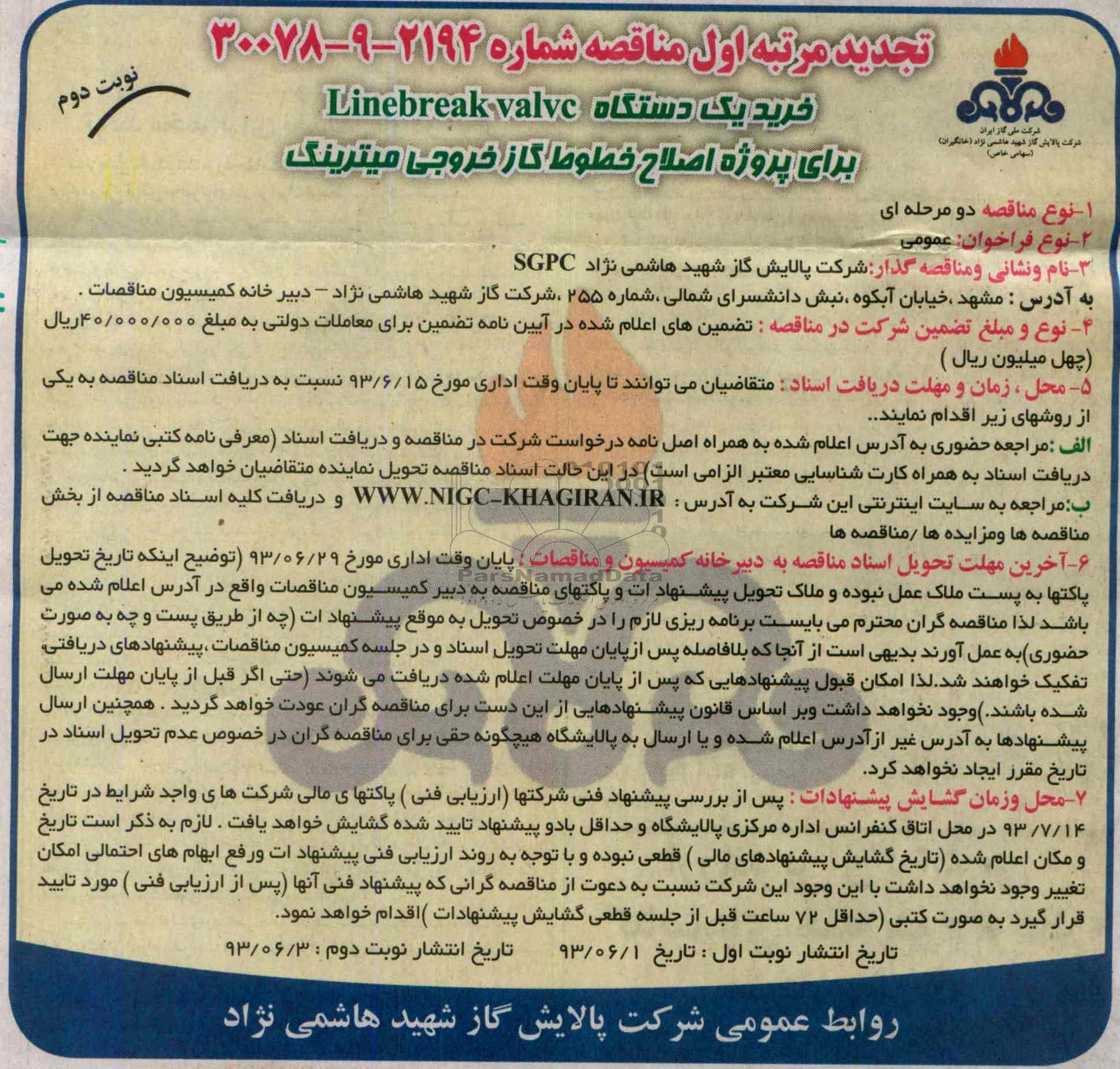نام و نشانی مناقصه گذار: شرکت پالایش گاز شهید هاشمی نژاد SGPC