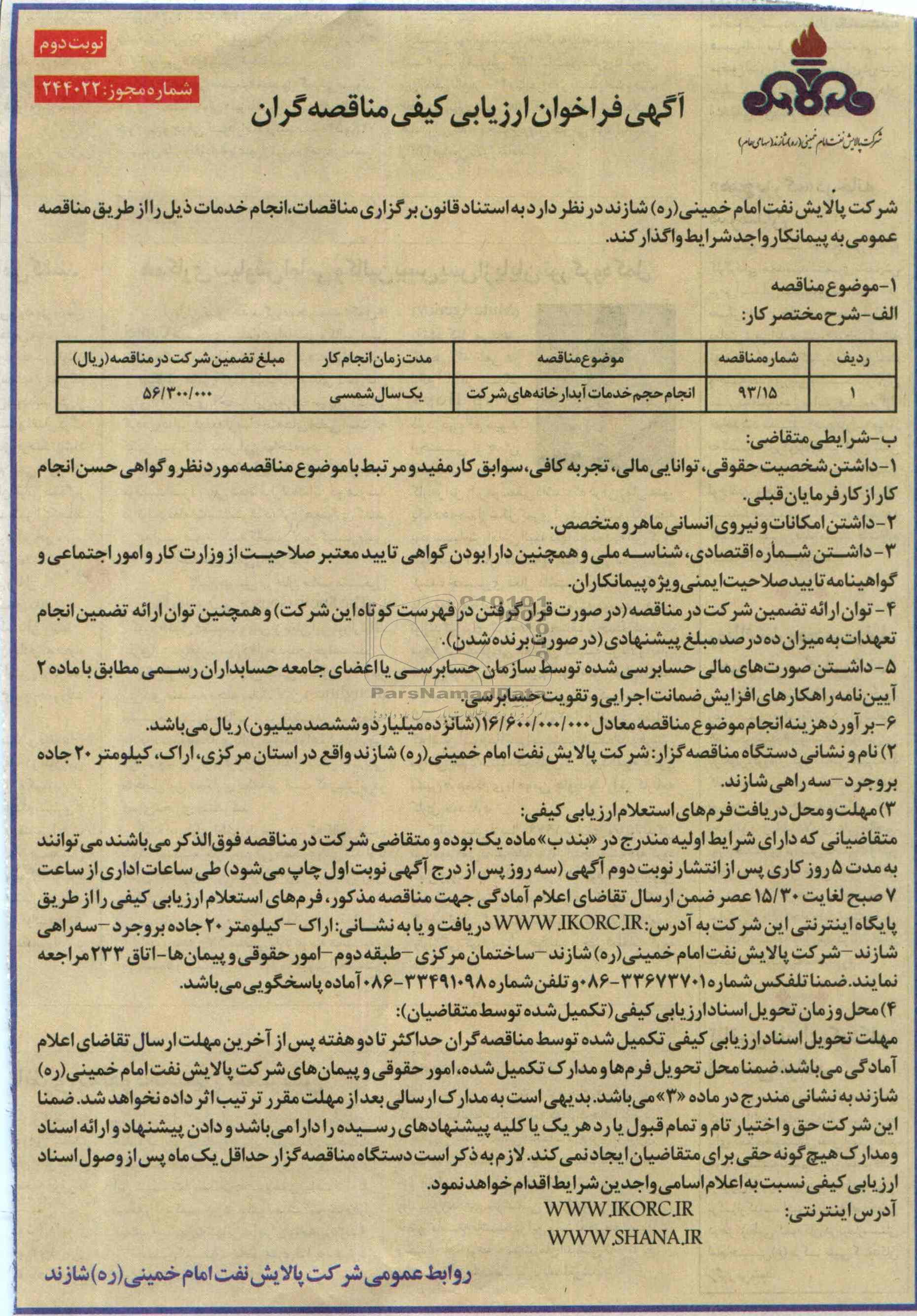 شرکت پالایش نفت امام خمینی (ره) شازند در نظر دارد به استناد قانون برگزاری مناقصات، انجام خدمات ذیل را از طریق مناقصه عمومی به پیمانکار واجد شرایط واگذار کند.