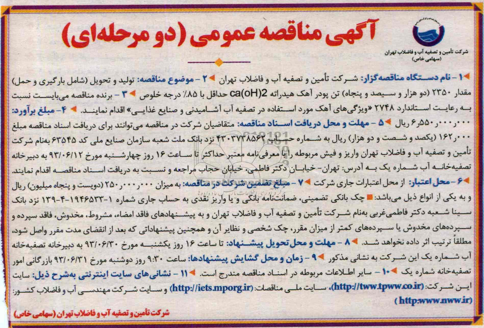 موضوع مناقصه: تولید و تحویل - شامل بارگیری و حمل - مقدار 2350 دو هزار و سیصد و پنجاه تن پودر آهک هیدراته CA(OH)2 حداقل با 85% در جه خلوص