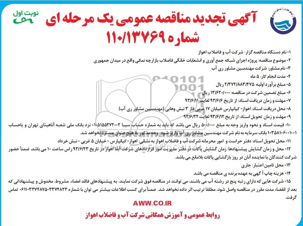 نام دستگاه مناقصه گزار : شرکت آب و فاضلاب اهواز