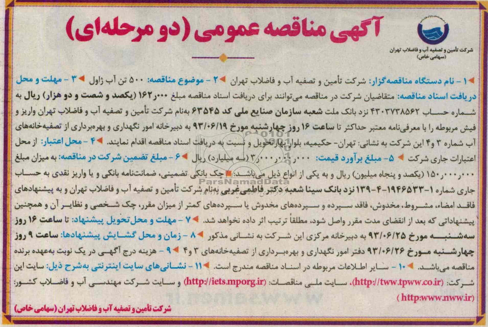 مناقصه 500 تن آب ژاول , آگهی مناقصه عمومی دو مرحله ای , مناقصه 500 تن آب ژاول