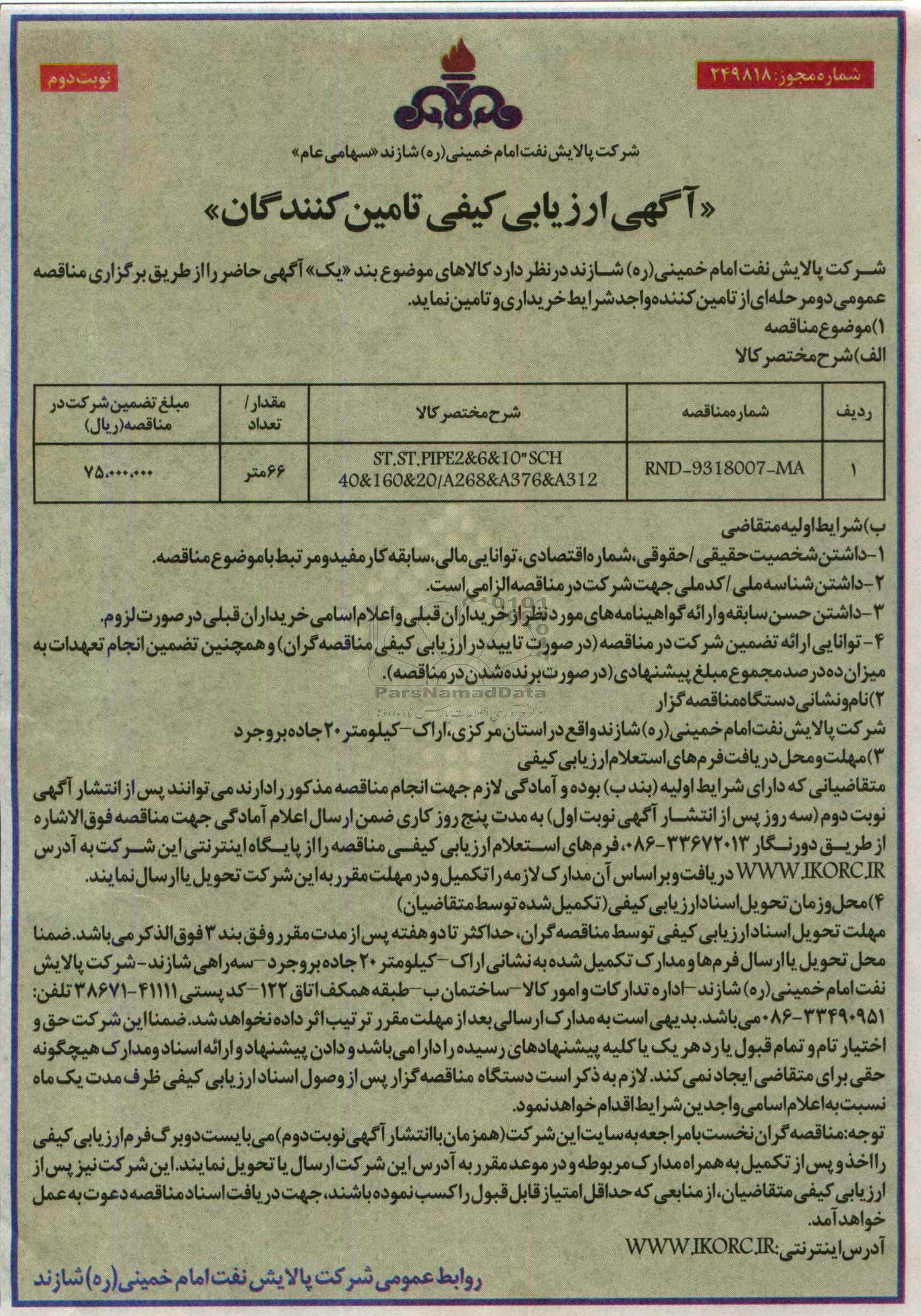 نام و نشانی دستگاه مناقصه گزار: شرکت پالایش نفت امام خمینی (ره) شازند واقع در استان مرکزی، اراک، کیلومتر 20 جاده بروجرد