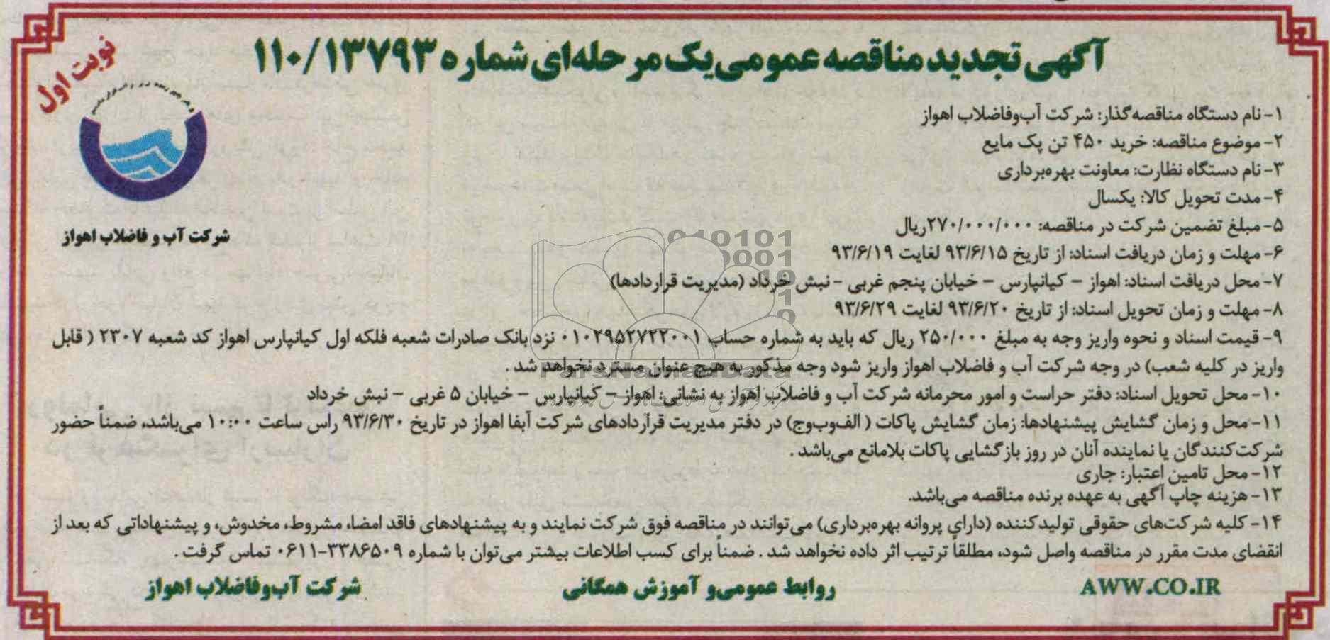 نام دستگاه مناقصه گزار : شرکت آب و فاضلاب اهواز