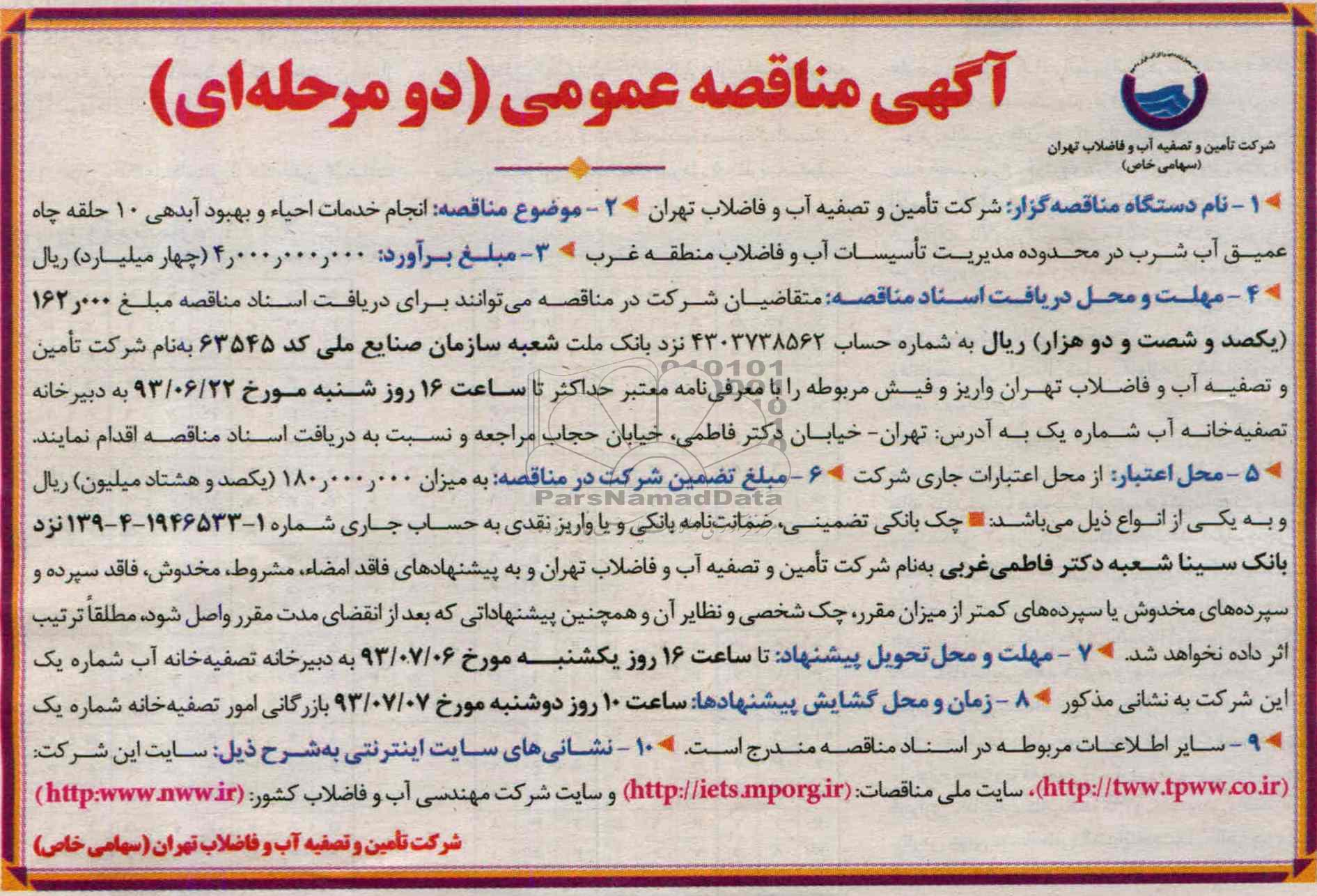 موضوع مناقصه: انجام خدمات احیاء و بهبود آبدهی 10 حلقه چاه عمیق آب شرب در محدوده مدیریت تاسیسات آب و فاضلاب منطقه غرب