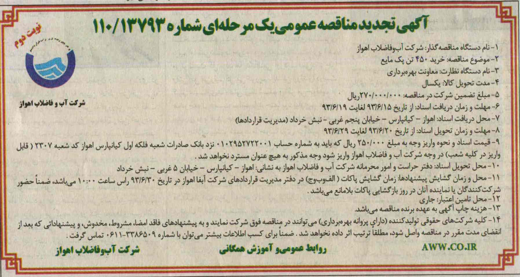 مناقصه خرید 450 تن پک مایع, آگهی تجدید مناقصه عمومی یک مرحله ای , مناقصه خرید 450 تن پک مایع