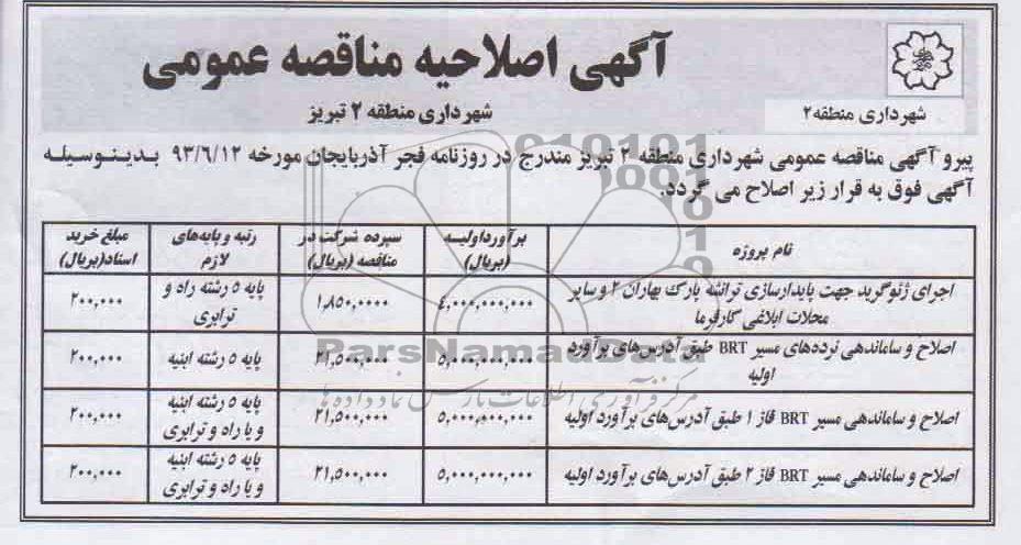پیرو اگهی مناقصه عمومی شهرداری منطقه 2 تبریز مندرج در روزنامه فجر آذربایجان مورخه 93.6.12 بدینوسیله اگهی فوق به قرار زیر اصلاح میگردد