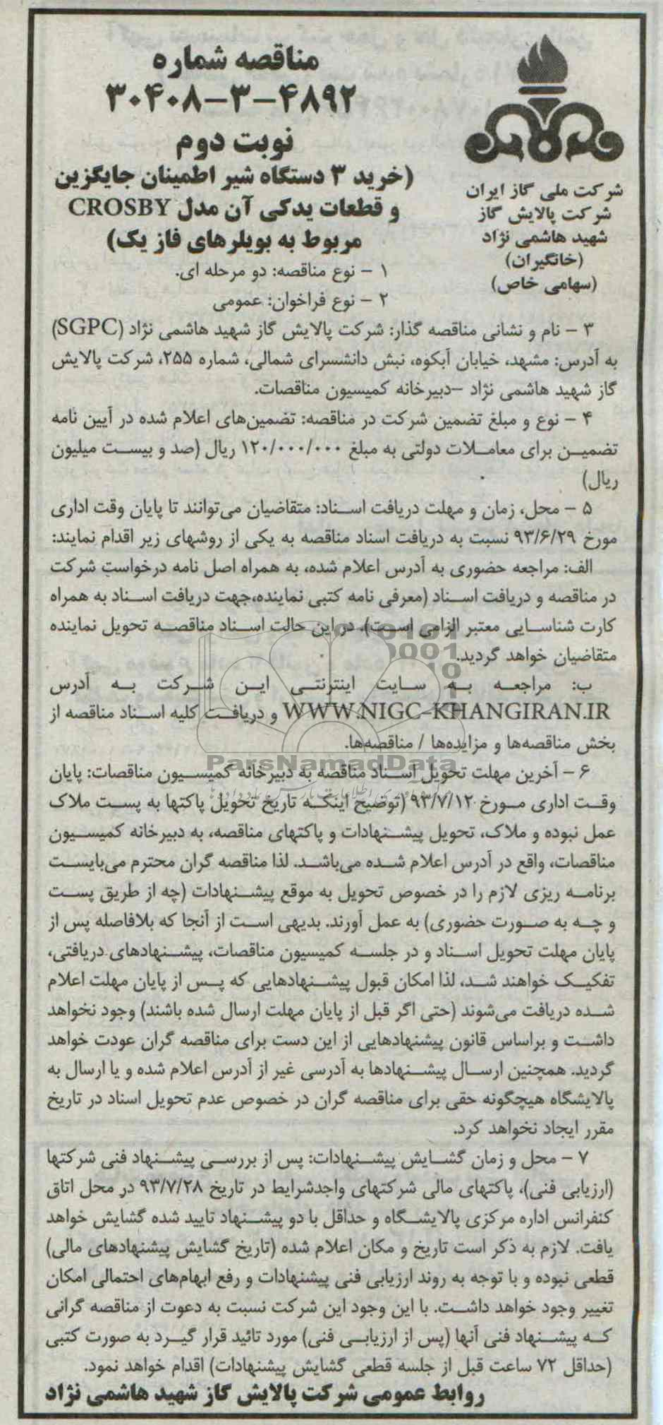 نام و نشانی مناقصه گذار: شرکت پالایش شهید هاشمی نژاد (SGPC) به آدرس: مشهد، خیابان آبکوه، نبش دانشسرای شمالی، شماره 255، شرکت پالایش گاز شهید هاشمی نژاد، دبیرخانه کمیسیون مناقصات