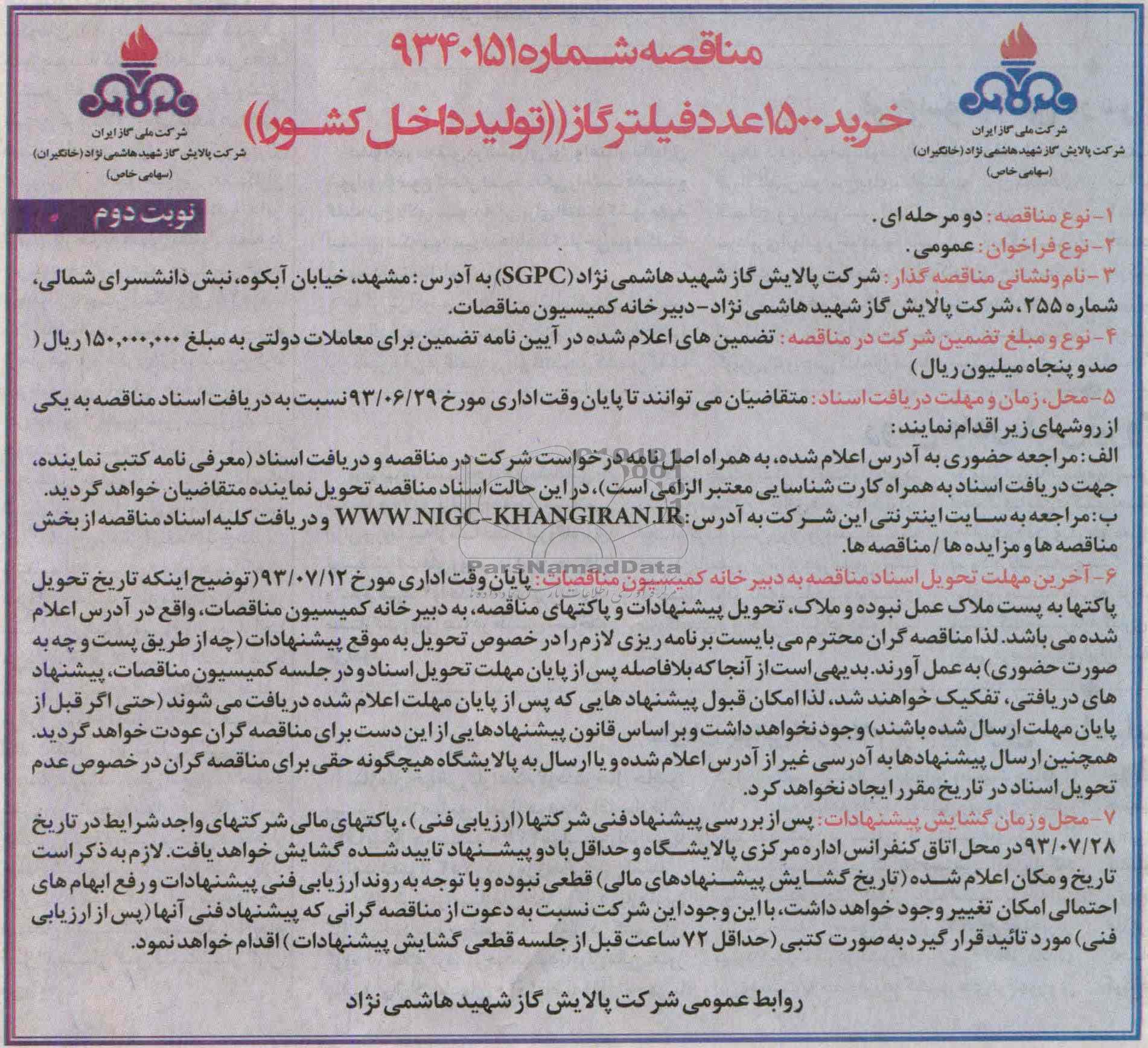 مناقصه خرید 1500 عدد فیلتر گاز تولید داخل کشور از کلیه افراد متخصص و شرکتها واجد شرایط دعوت به عمل میآید در مناقصه با کد خبرگزاری پارس نماد: 380756 شرکت نمایند.