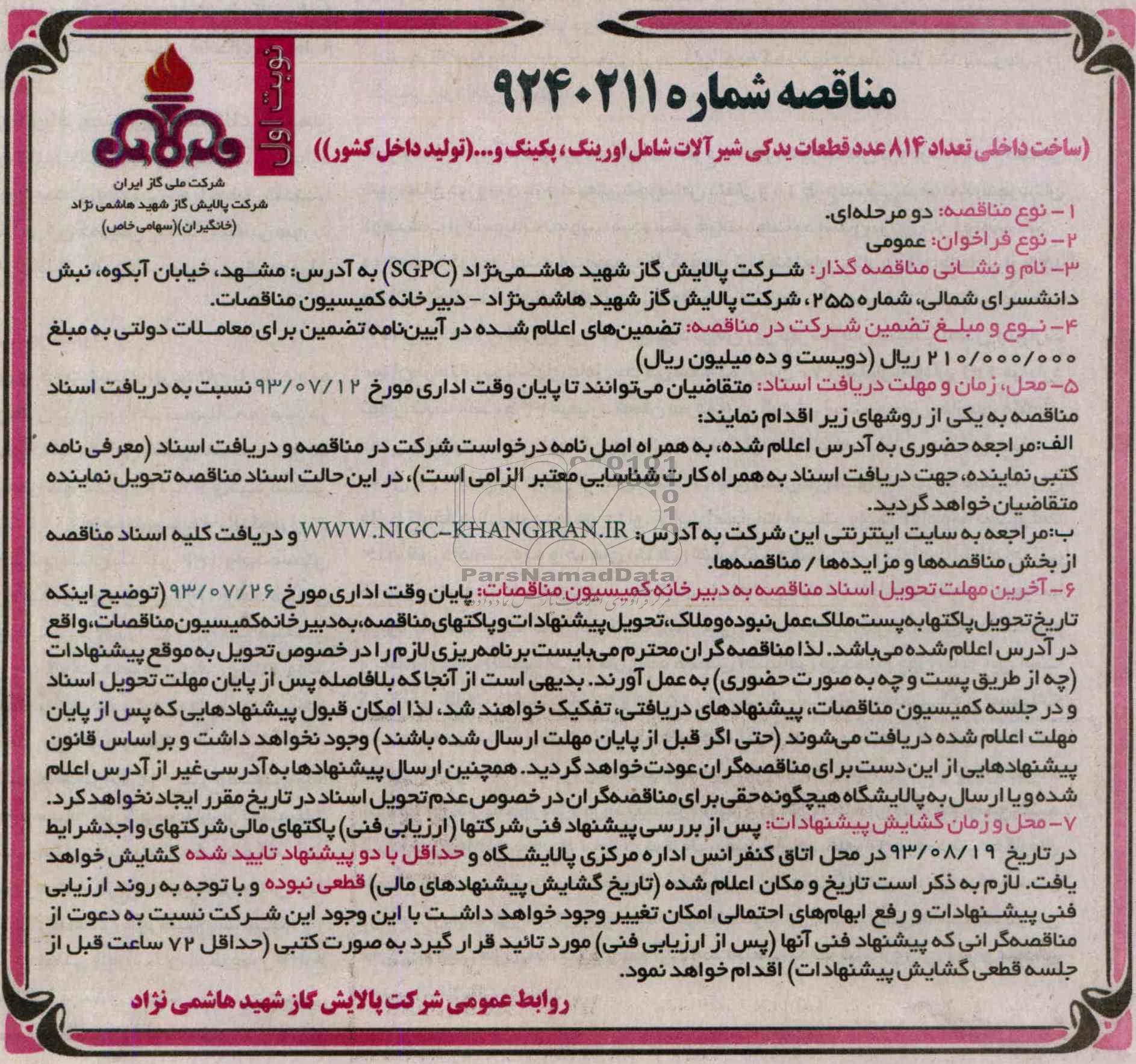 نام و نشانی مناقصه گزار شرکت پالایش گاز شهید هاشمی نژاد sgpc به ادرس مشهد خیابان آبکوه نبش دانشسرای شمالی شماره 255 شرکت پالایش گاز شهید هاشمی نژاد دبیرخانه کمیسیون مناقصات