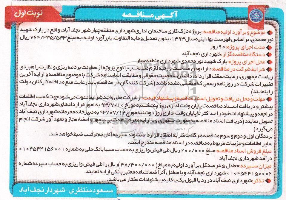موضوع و برآورد اولیه مناقصه: پروژه نازک کاری ساختمان اداری شهرداری منطقه چهار شهر نجف آباد، واقع در پارک شهید نورمحمدی، براساس فهرست بهاء ابنیه سال 1393، بعدون تعدیل و مابه التفاوت، با برآورد اولیه: به مبلغ 764.335.533 ریال