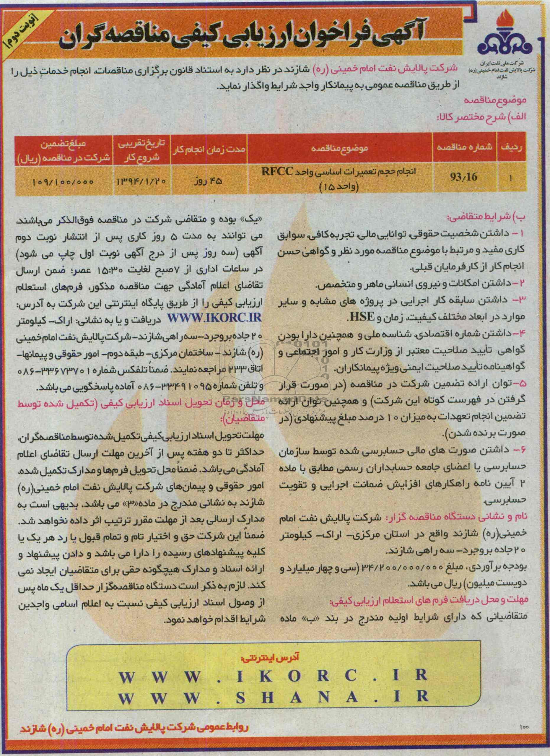 | 16/93 | انجام حجم تعمیرات اساسی واحد RFCC(واحد 15) | 45 روز | 94.1.20 | 109.100.000 |