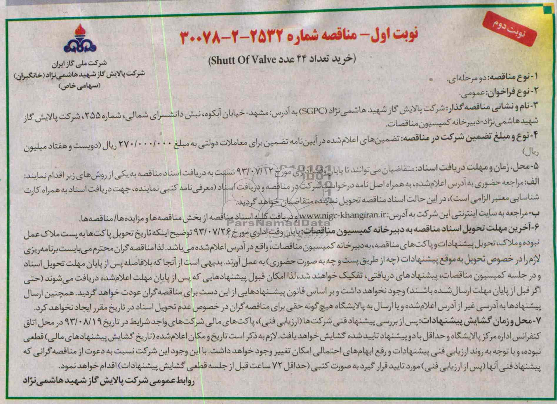 خرید تعداد 24 عدد SHUTT OF VALVEمناقصه از کلیه افراد متخصص و شرکتها واجد شرایط دعوت به عمل میآید در مناقصه با کد خبرگزاری پارس نماد: 382807 شرکت نمایند.