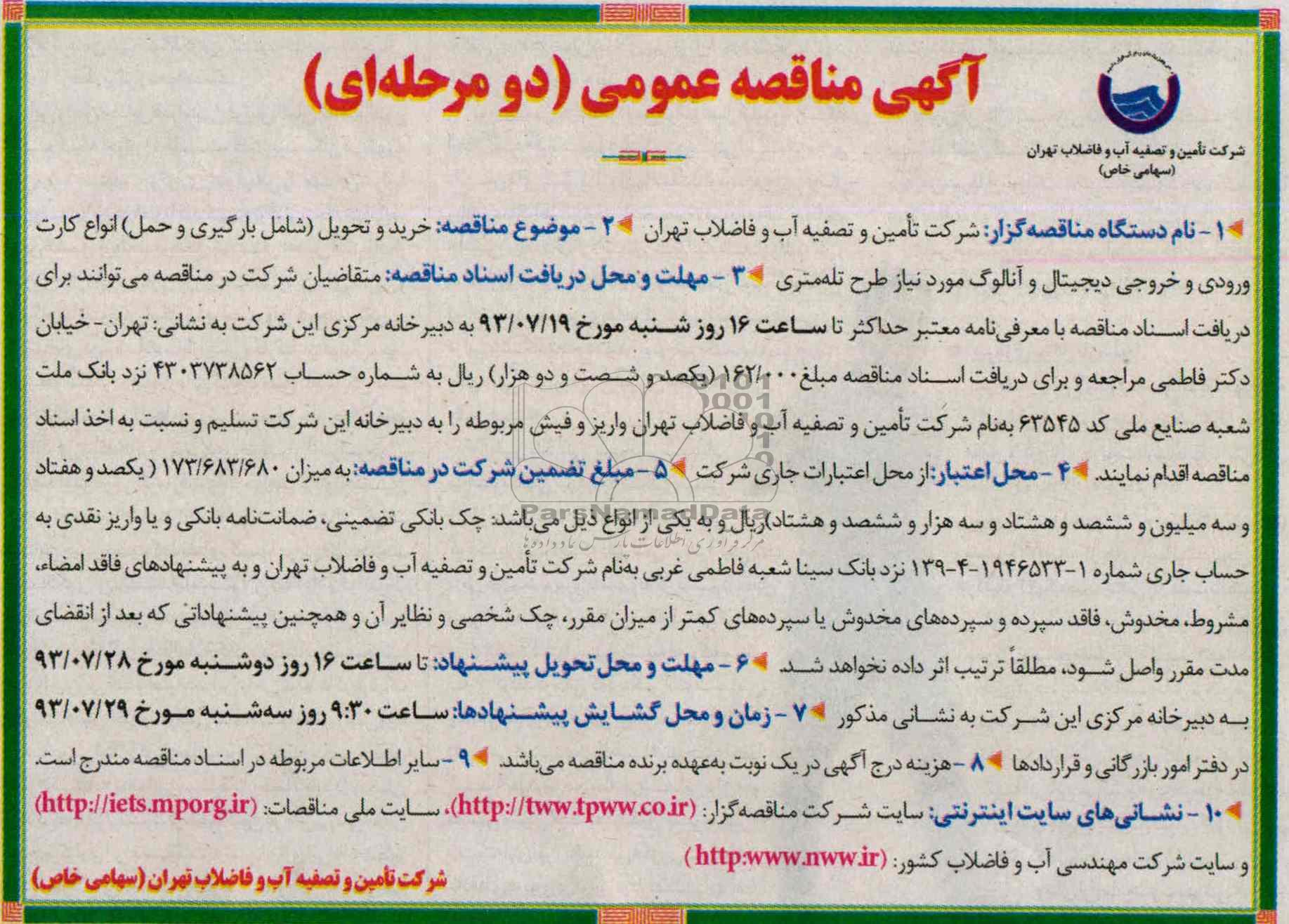 نام دستگاه مناقصه گزار: شرکت تأمین و تصفیه آب و فاضلاب تهران