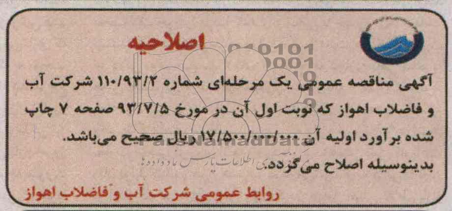 اگهی مناقصه عمومی یک مرحله ای شماره 2/93/110 شرکت آب و فاضلاب اهواز که نوبت اول ان در مورخ 93.7.5 صفحه 7 چاپ شده برآورد اولیه ان 17.500.000.000 ریال صحیح میباشد