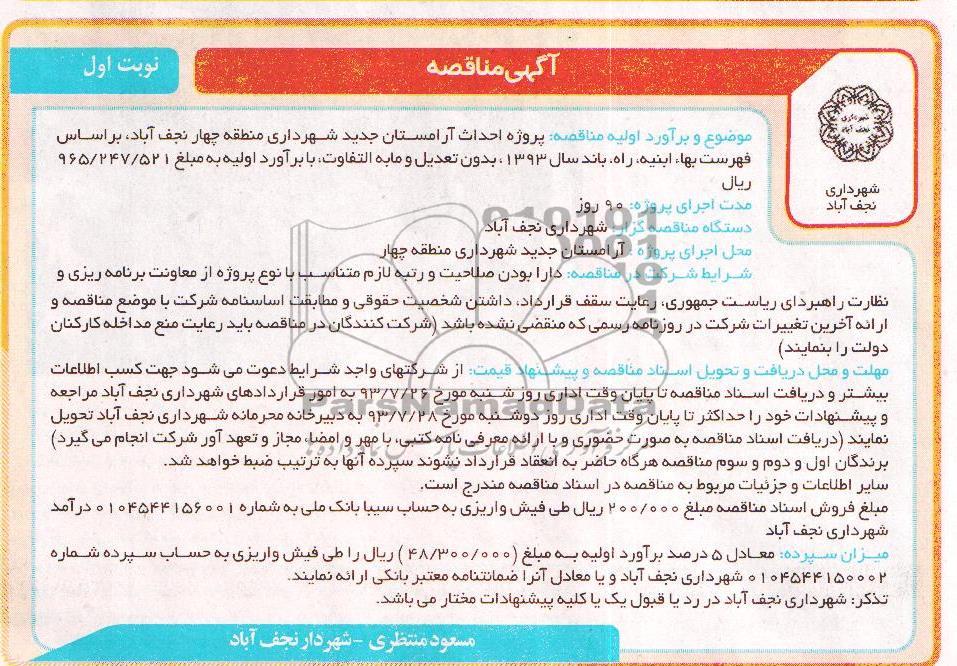موضوع و برآورد اولیه مناقصه: پروژه احداث آرامستان جدید شهرداری منطقه چهار نجف آباد براساس فهرست بهاء ابنیه ، راه و باند سال 1393 بدون تعدیل و مابه التفاوت با برآورد اولیه به مبلغ 965.247.521 ریال