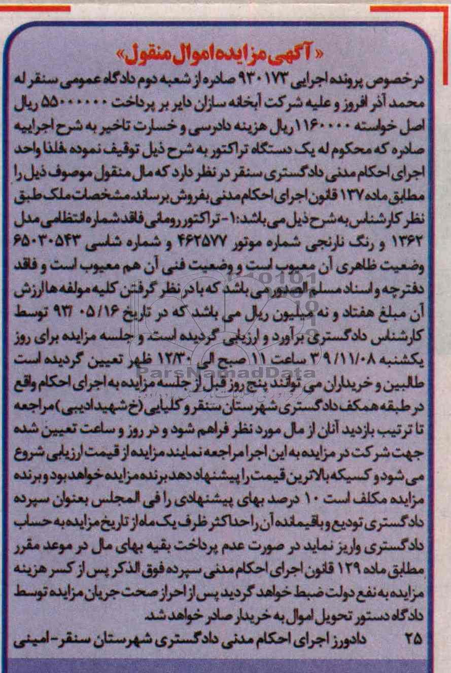 جلسه مزایده در روز یکشنبه 93.11.8 ساعت 11 صبح الی 12:30 ظهر تعیین گردیده است.