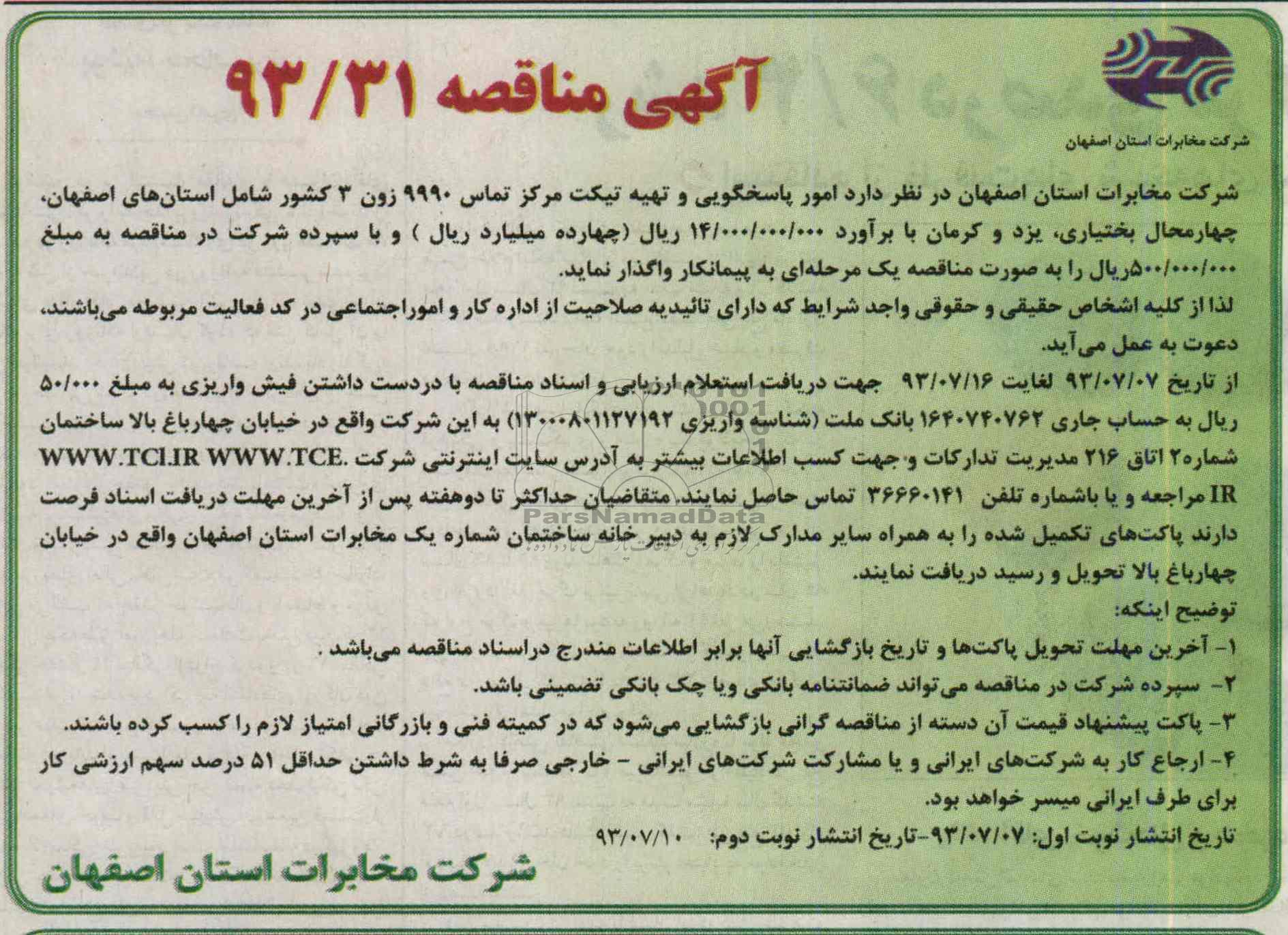 شرکت مخابرات استان اصفهان درنظردارد امور پاسخگویی و تهیه تیکت مرکز تماس 9990 زون 3 کشور شامل استان های اصفهان چهارمحال و بختیاری یزد و کرمان با برآورد 14.000.000.000 ریال چهارده میلیارد ریال و با سپرده شرکت در مناقصه به مبلغ 500.000.000 ریال را به صورت مناقصه یک مرحله ای به پیمانکار واگذار نماید