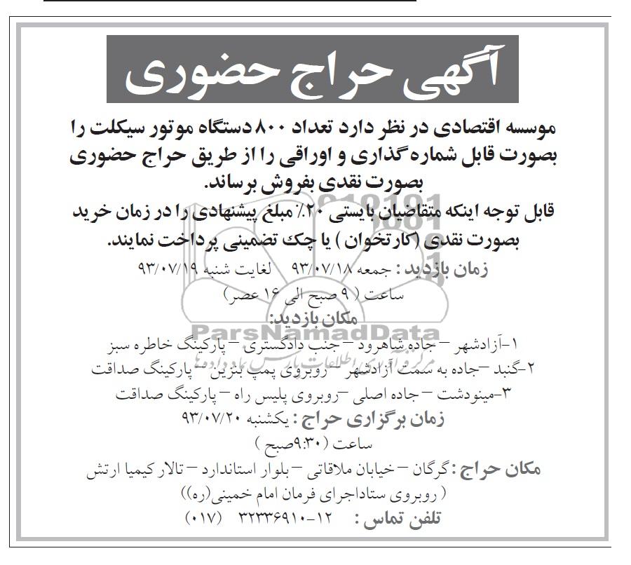 مزایده عمومی مزایده حراج حضوری تعداد 800 دستگاه موتورسیکلت برگزار میگردد. از کلیه افراد متخصص و شرکتهای واجد شرایط دعوت به عمل میآید تا در این مزایده با کد خبرگزاری پارس نماد : 389046 شرکت نمایند تاریخ شروع مزایده : 1393/07/15 مهلت شرکت در مزایده: تا پایان روز 1393/07/19
